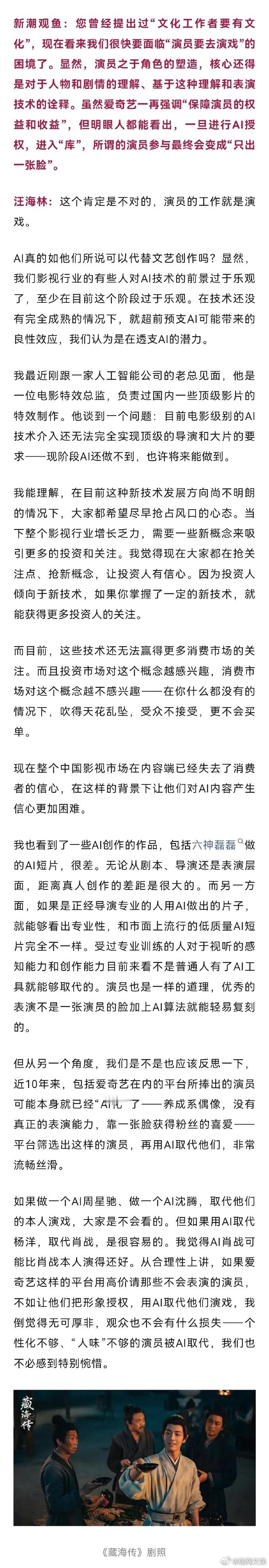 汪海林说偶像演员被AI取代不必惋惜对于演员进行AI授权入“库”,表示优秀的表演不是一张演员的脸加上AI算法就能轻易复刻的: