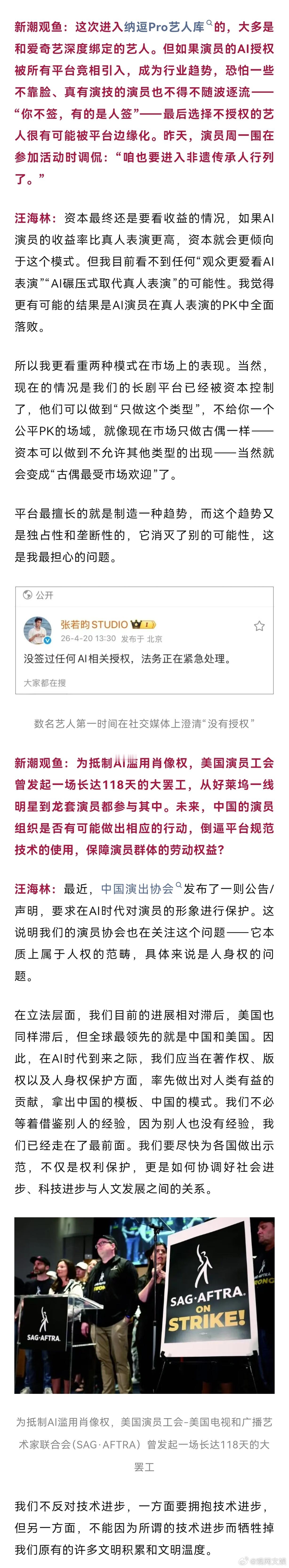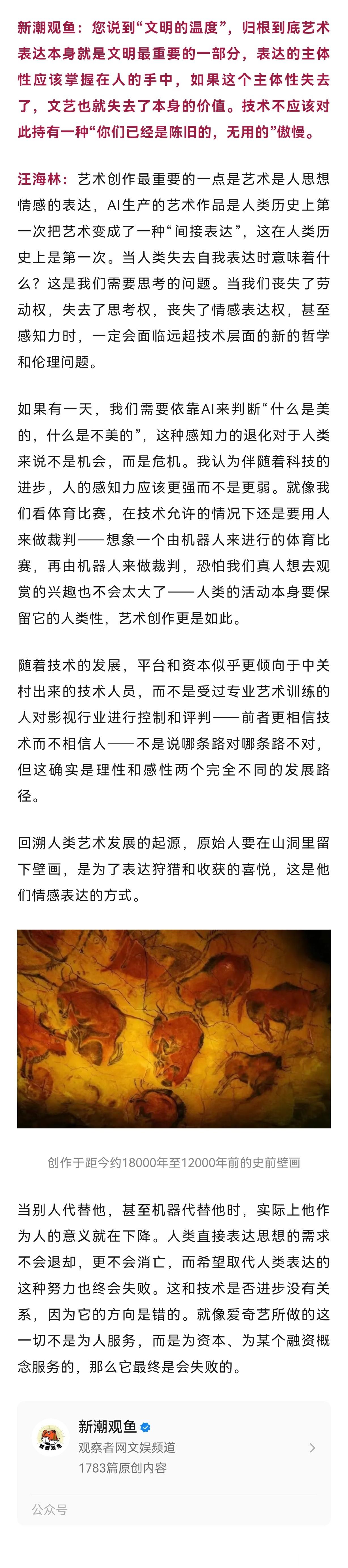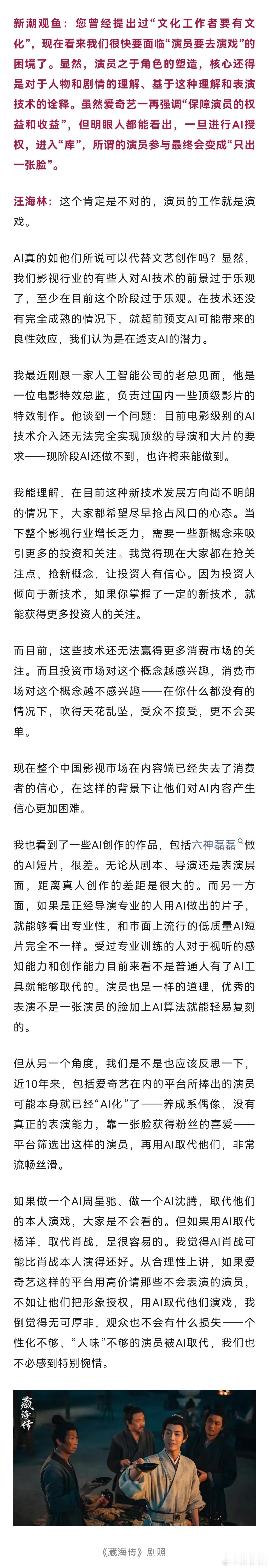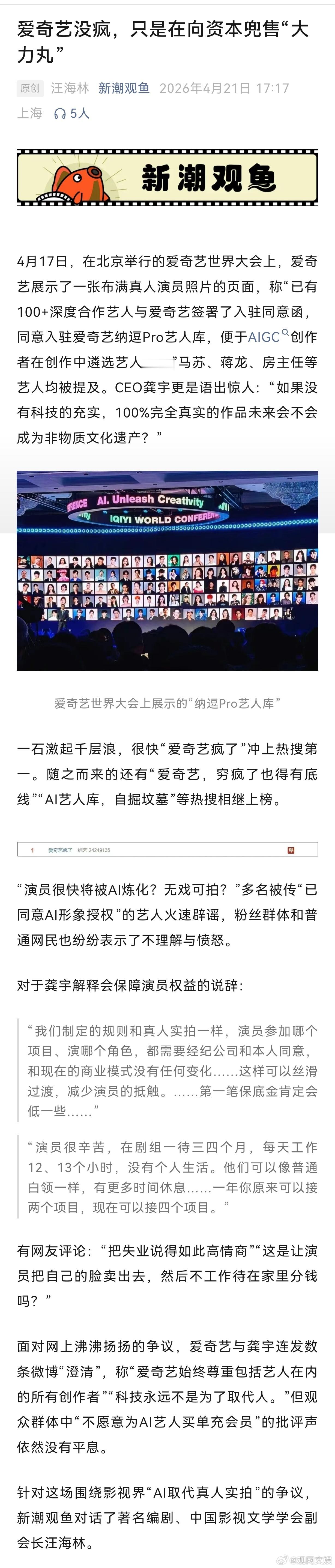 【爱奇艺没疯只是在向资本兜售大力丸】爱奇艺为AI押赌注而消费者不买单爱奇艺CEO龚宇的一场演讲一石激起千层浪,面对网上沸沸扬扬的争议,爱奇艺与龚宇连发数条微博“澄清”,称“爱奇艺始终尊重包括艺人在内的所有创作者”“科技永远不是为了取代人。”但观众群体中“不愿意为AI艺人买单充会员”的批评声依然没有平息。针对这场围绕影视界“AI取代真人实拍”的争议,新潮观鱼对话了著名编剧、中国影视文学学会副会长。