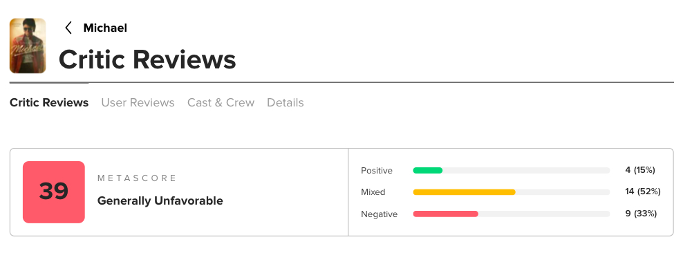 传记片《迈克尔·杰克逊:巨星之路》口碑解禁,扑了个大的。烂番茄新鲜度只有27%,13鲜35烂。metacritic仅39分。很多差评都在说表演部分虽然精彩,但没有深入刻画人物,非常空洞的传记片。