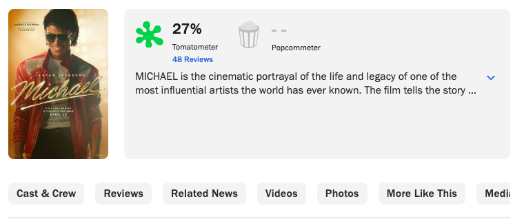 传记片《迈克尔·杰克逊:巨星之路》口碑解禁,扑了个大的。烂番茄新鲜度只有27%,