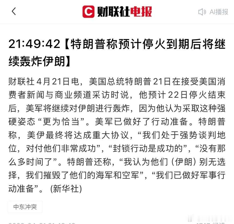川普称预计停火到期后将会继续轰炸伊朗;
