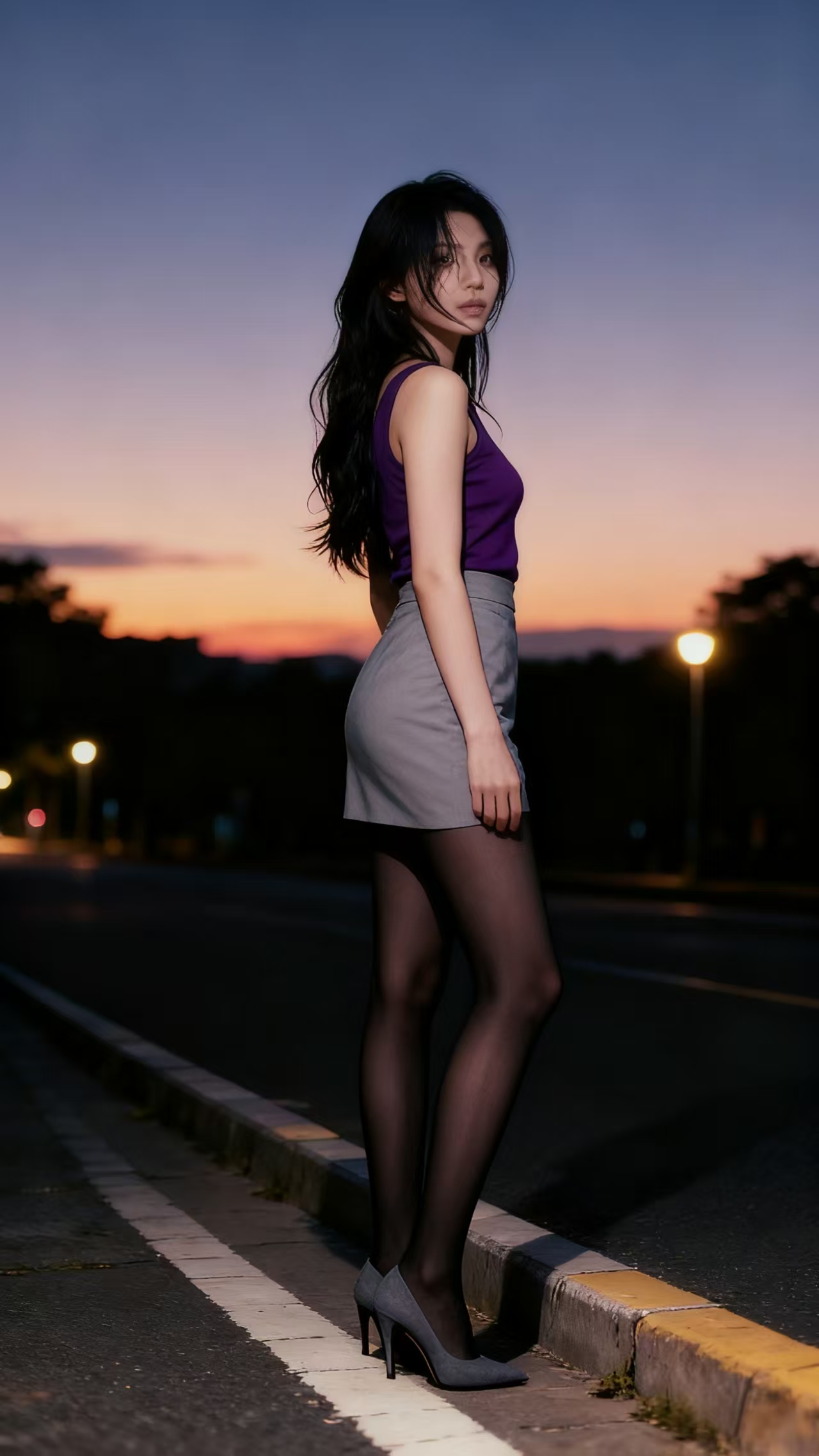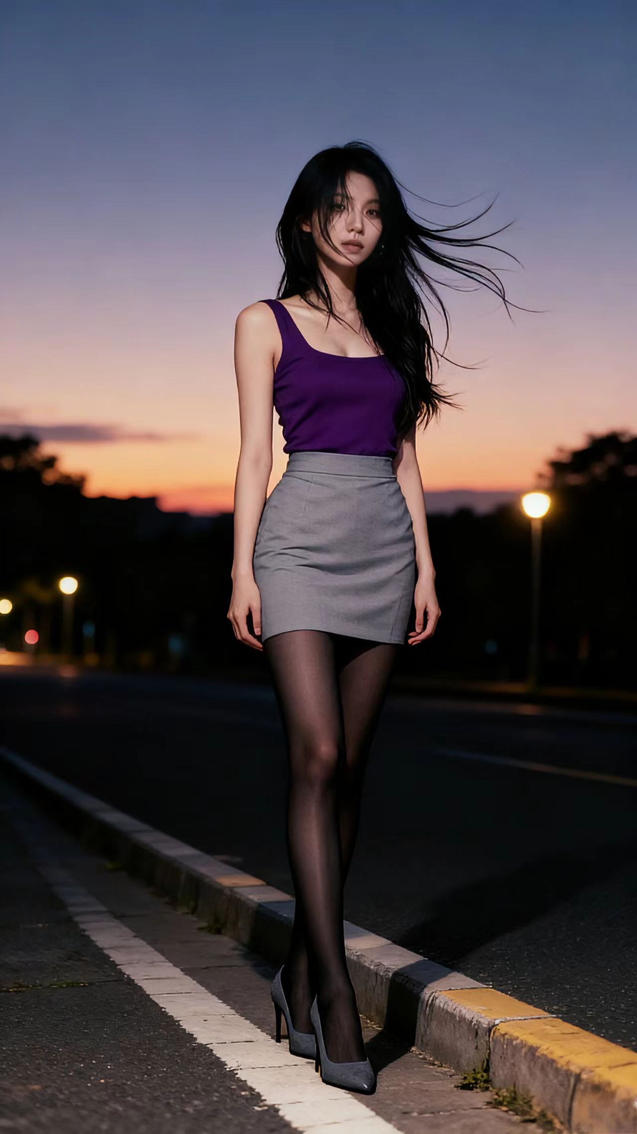 - 上衣:深紫色无袖紧身背心,剪裁贴身,凸显身材线条。
