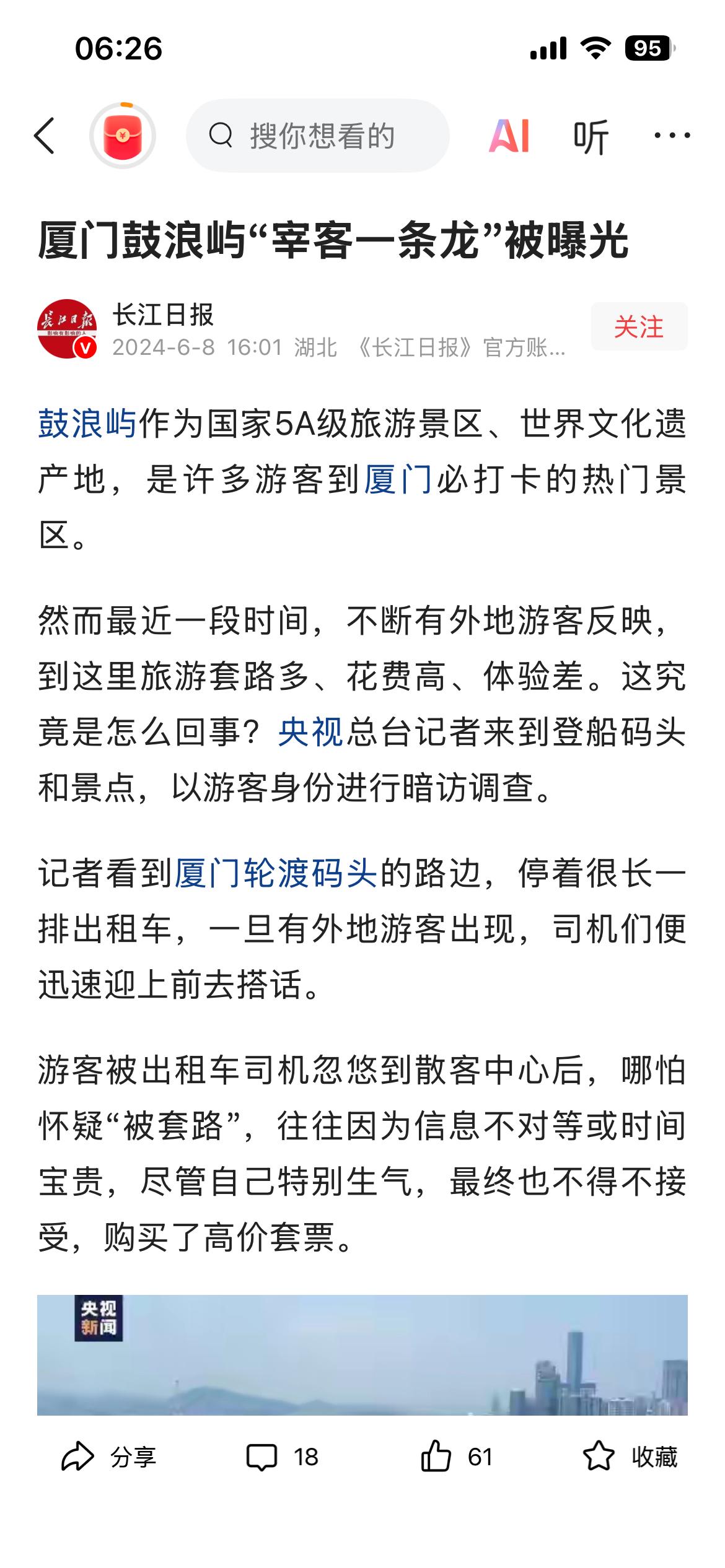 相比较 厦门能占央视的大版面 因为鼓浪屿 宰客一条龙;