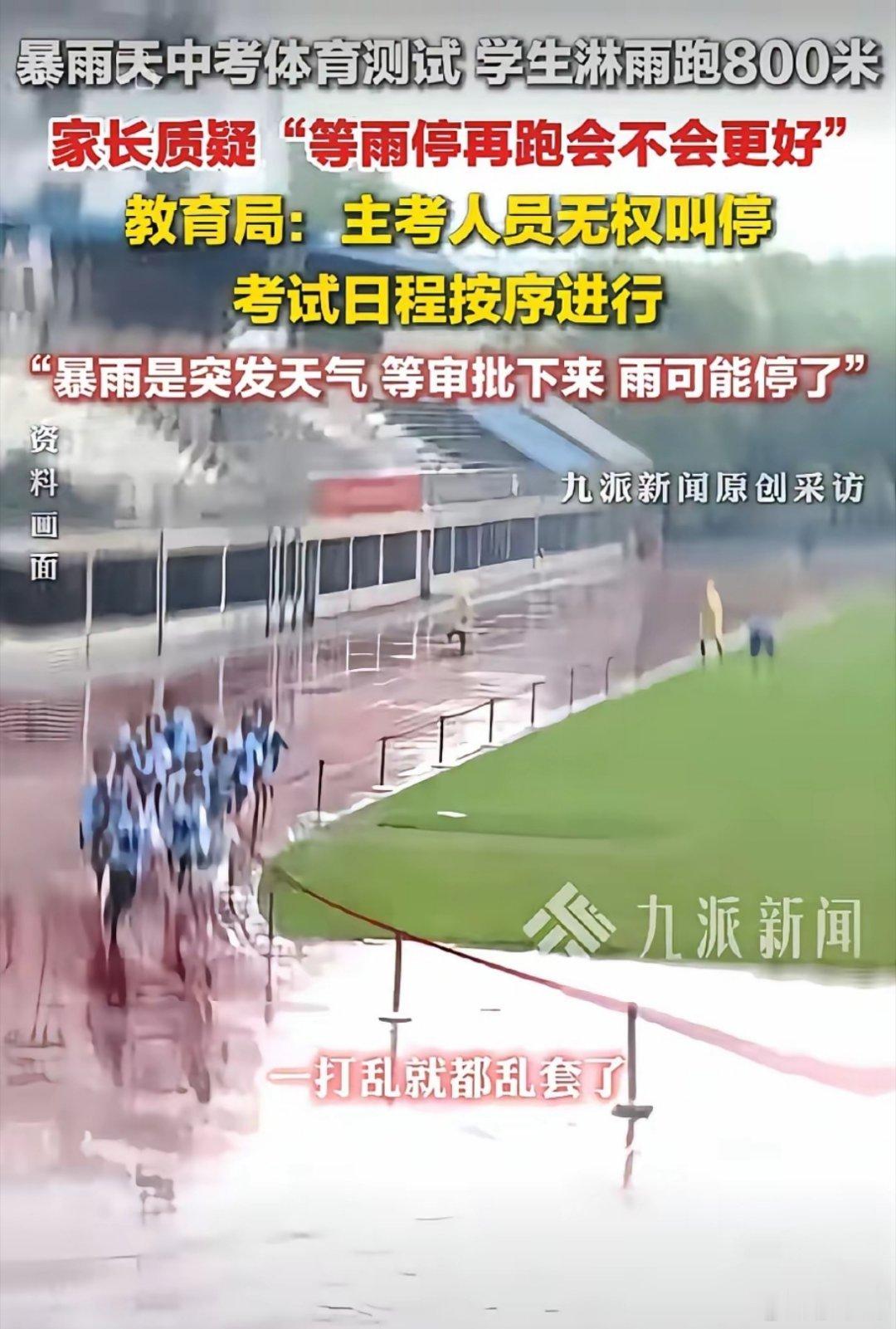 河北衡水这边,学生在瓢泼大雨里淋着跑800/1000米,家长急得跳脚,教育局一句“主考无权叫停,等审批下来雨都停了”。
