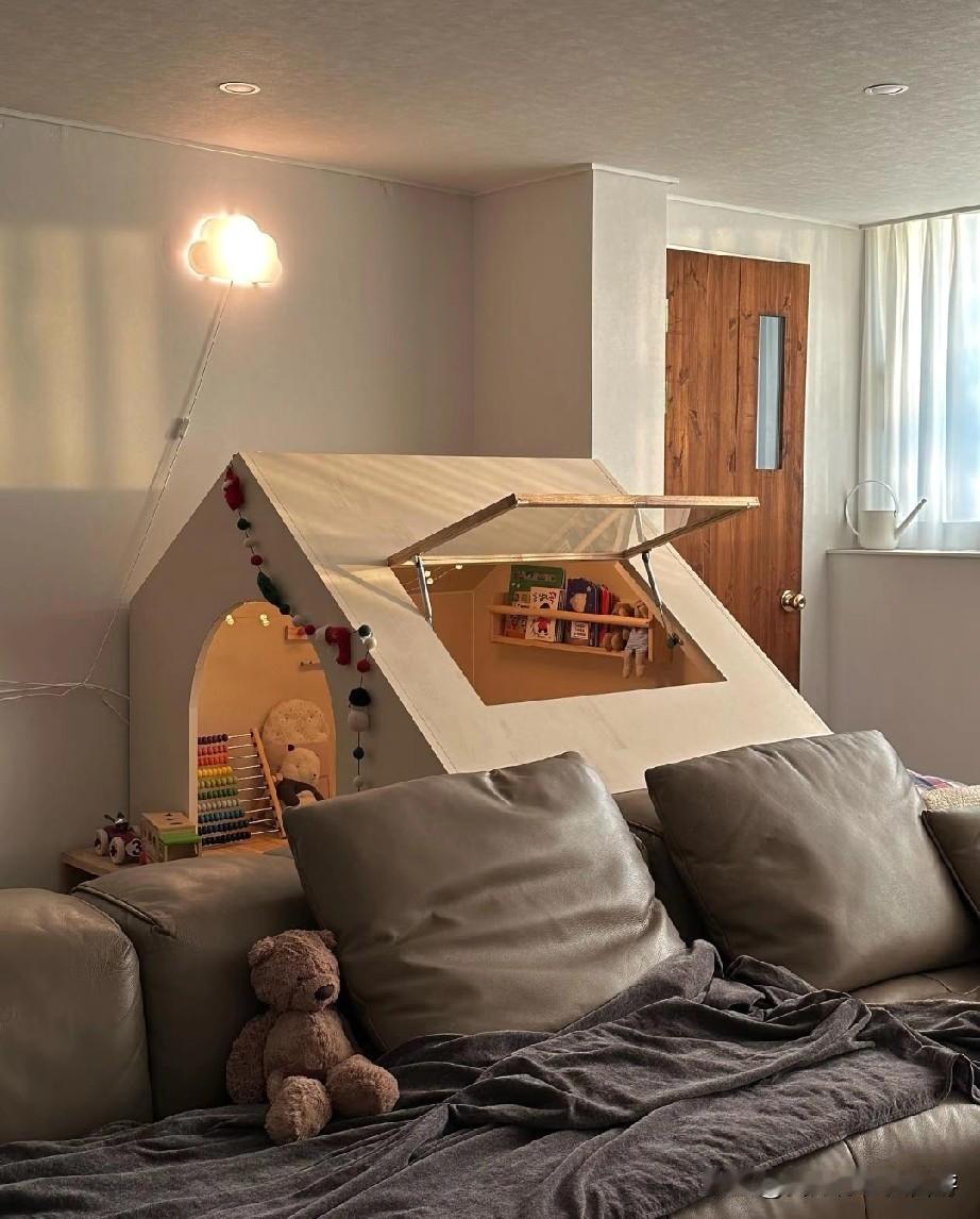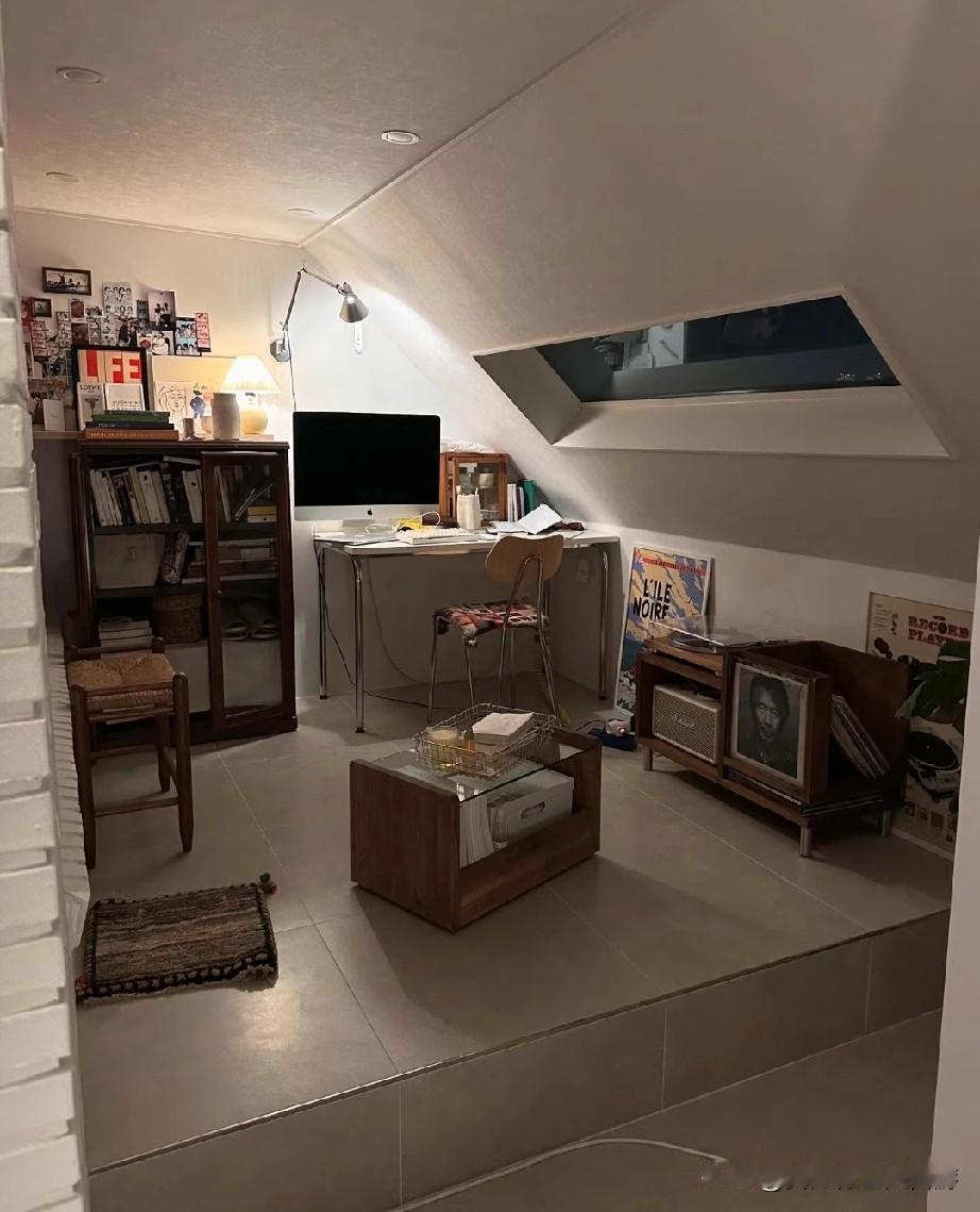 这个阁楼最打动我的,就是它没有刻意追求太满的装饰, 而是慢慢把生活里真正会用到、也真心喜欢的东西,一点点放进去。天窗下的书桌、暖黄的灯光、木质家具、柔软的床铺,还有留给小朋友玩耍的小角落, 每一处都很温柔,也很有日常感。