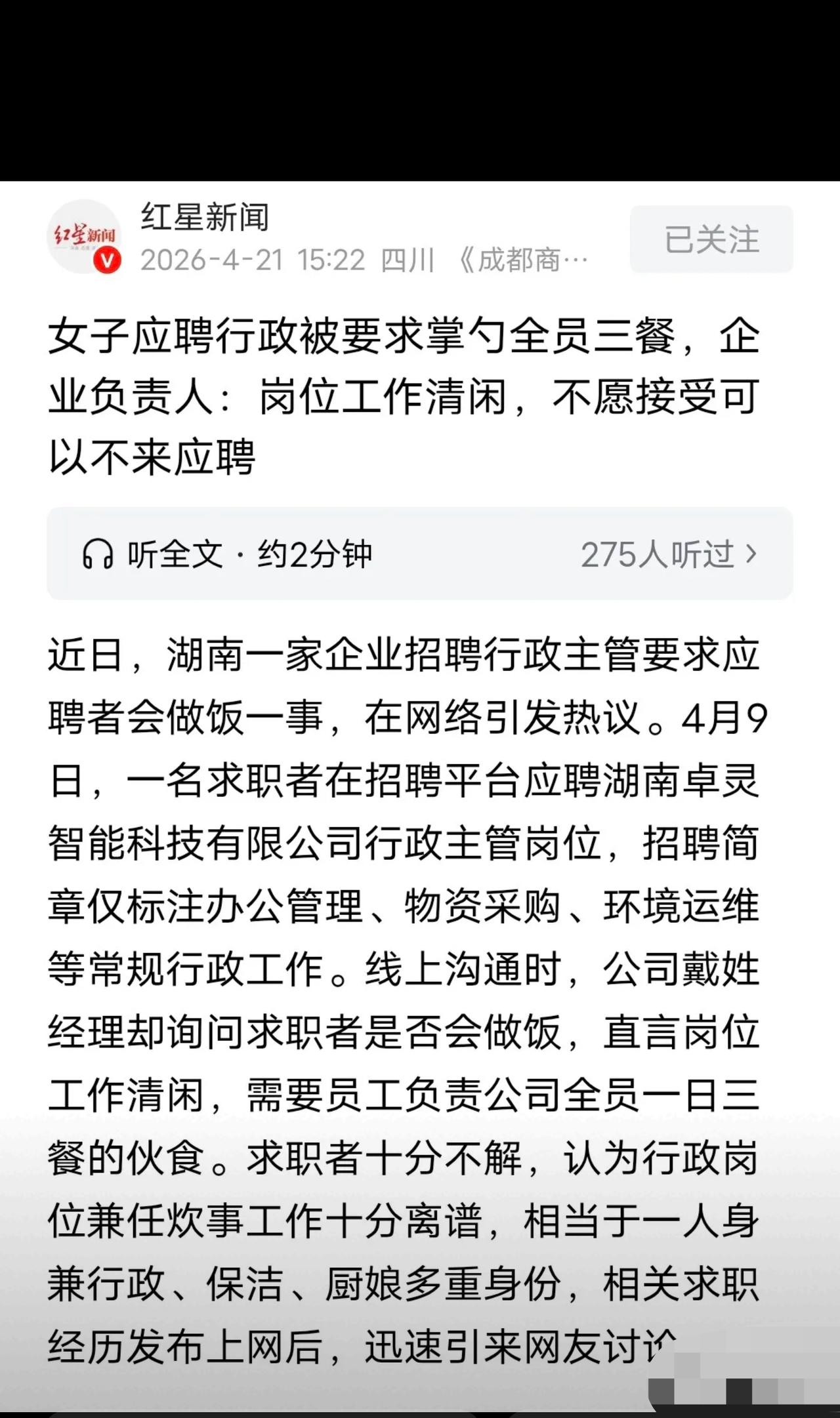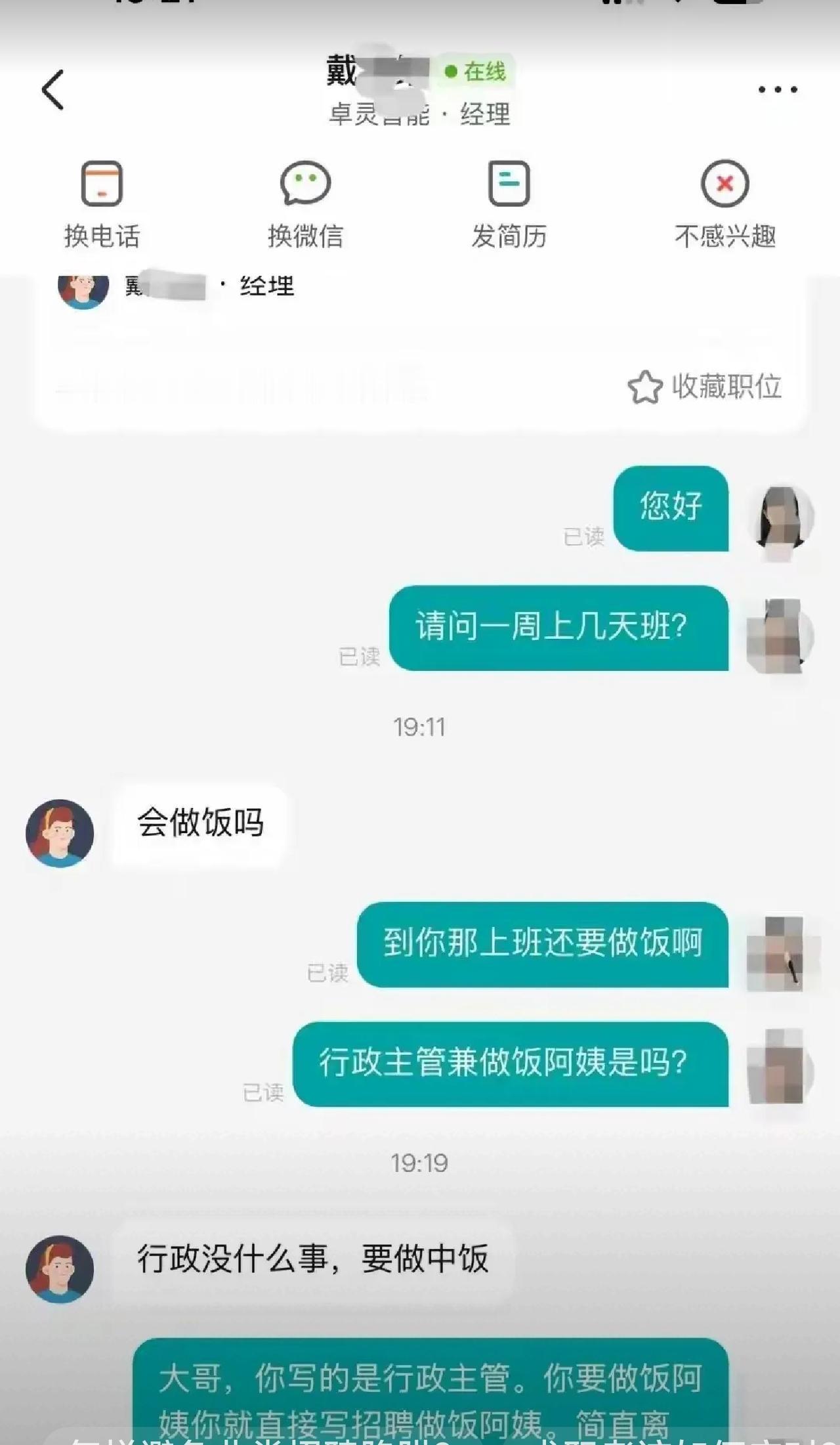 离谱!湖南,女子在平台应聘一家科技公司的行政主管岗位,公司经理问女子:会做饭吗?女子懵了,经理解释:岗位清闲,你需要负责全员工的一日三餐。女子认为简直离谱,明明是行政岗位,却要一人身兼行政、保洁、厨娘等身份,可没想到,经理硬刚:不接受,可以不来,这是公司选人,不是人选公司。