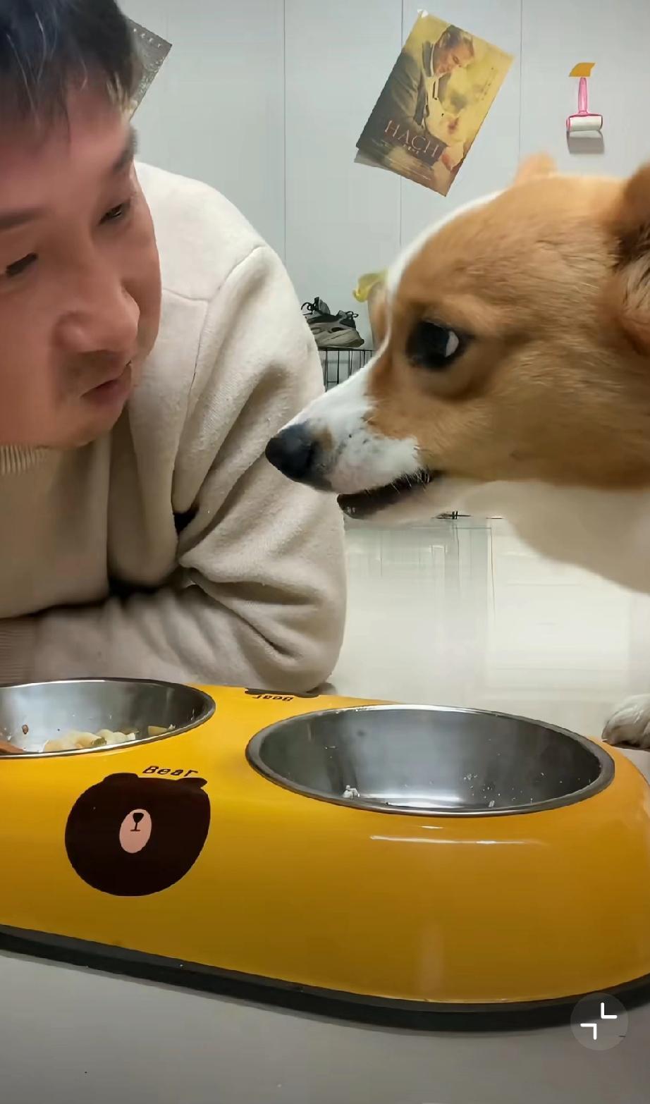 狗狗正低头吃饭,主人直接拿筷子从狗碗里夹出食物,塞进自己嘴里,毫无顾忌!
