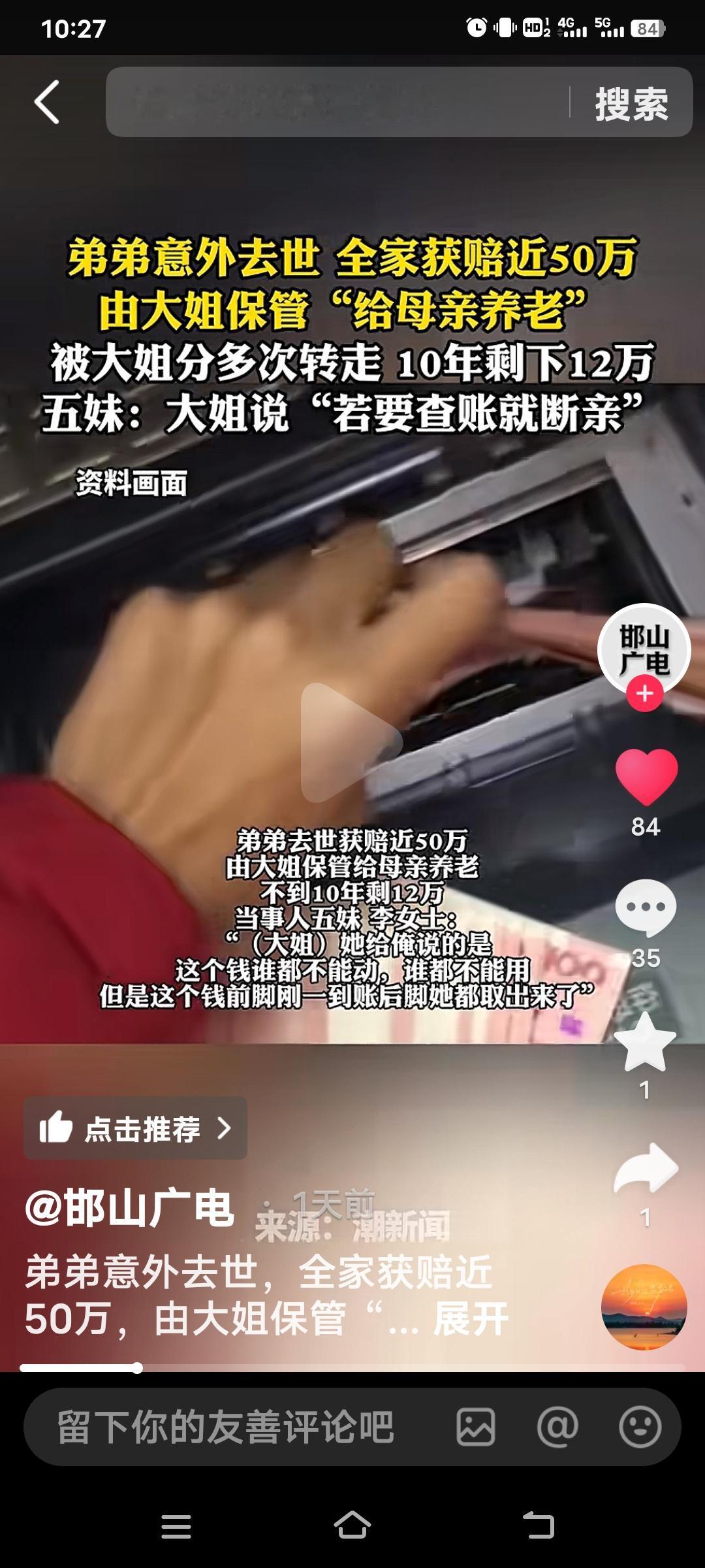 开封李女士家这事儿太闹心了。十年前弟弟意外去世获近50万赔偿款,本是给82岁老母亲养老的,却被大姐搞成这样。赔偿款打到母亲卡上由大姐保管,可如今不到十年就只剩12万。