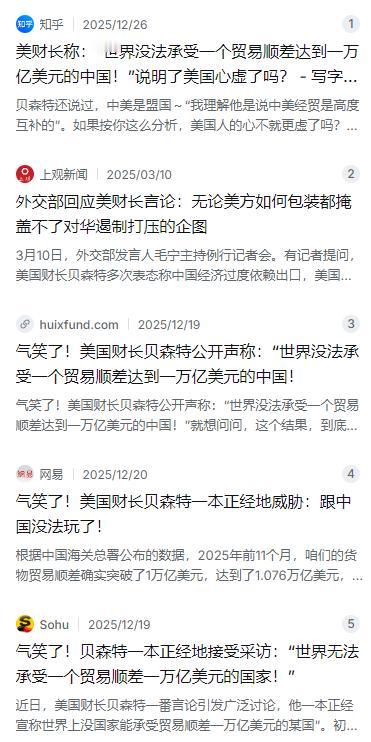 回到贝森特口中的“万亿美元顺差”。他故意把中国对全球的货物贸易顺差,嫁接到美国头上,纯属颠倒黑白。2025年中美双边实际贸易顺差大概只有2000多亿美元,和他说的一万亿美元差了整整7000多亿。而且2025年中国对美出口实际上降了两成,但东盟、非洲、拉美这些新兴市场把缺口补上来了。