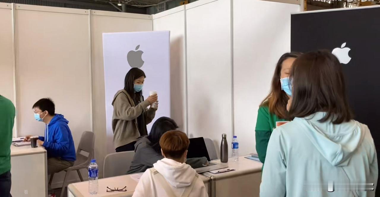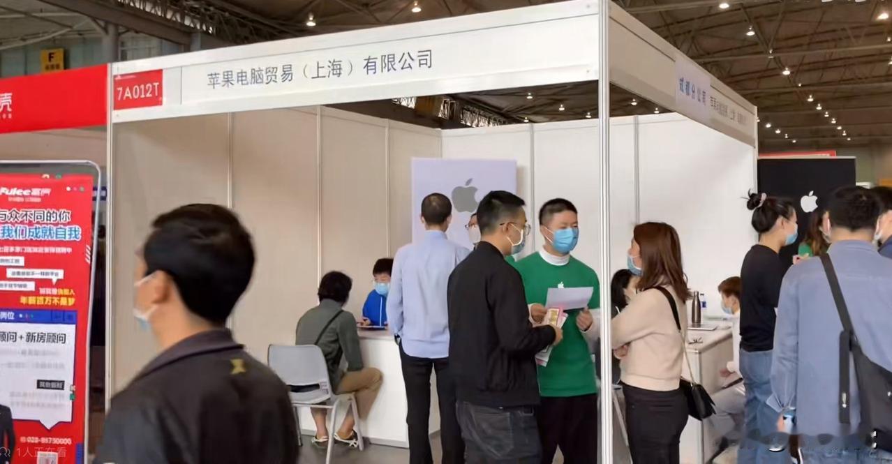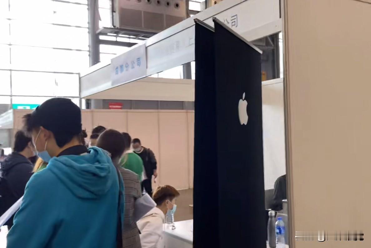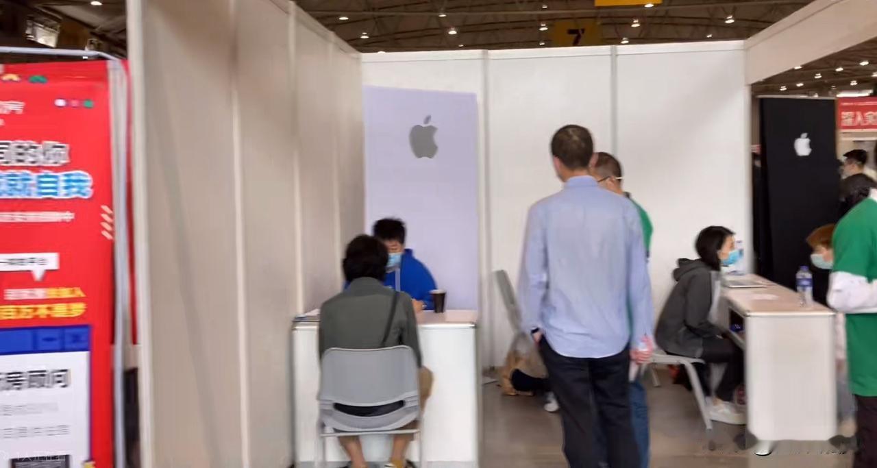 立在地上的海报上看不到招聘岗位、职位要求,也没有公司介绍和图片,甚至连一个字都没有,只有一个logo,摊位里就只有两三个大学生模样的小年轻和求职者在聊天,整个招聘市场里只有这一家公司与众不同,它的名字叫苹果。