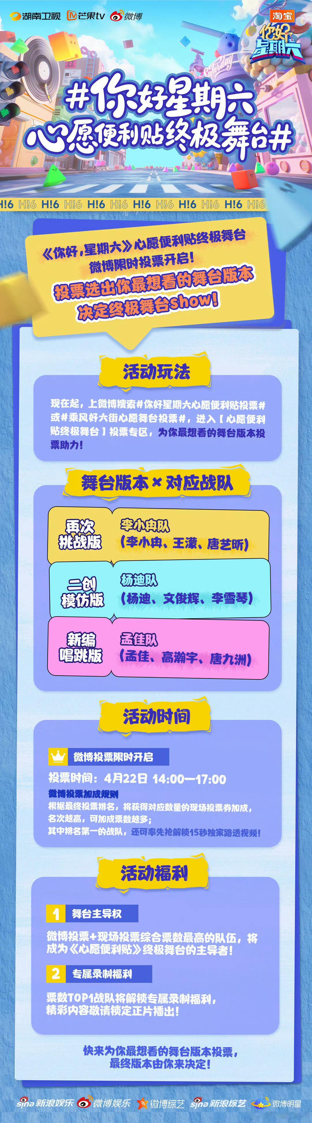 你好星期六心愿便利贴终极舞台好六街挑战《心愿便利贴》啦!三大战队风格迥异亮点十足,和原版开启趣味对决,现在投票就能解锁独家路透,快来为心仪战队打call~乘风好六街心愿舞台投票你好星期六