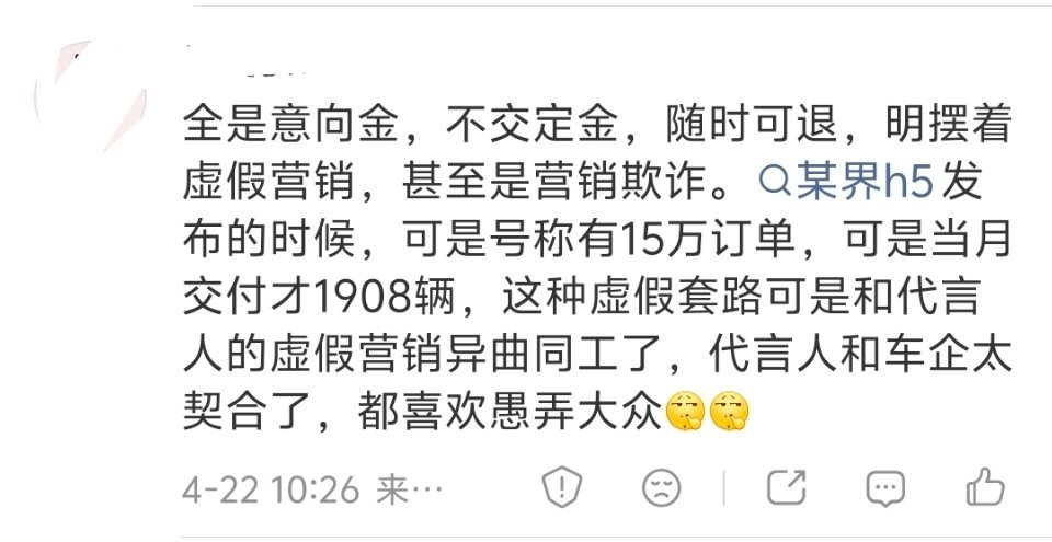 哈哈打假人人有责。尚界已经不止一回这么干了。尚界H5刚上市的时候,吹嘘15万小订(1000元门槛,可退),实际上市当月销量1901辆左右,可见这里面的营销水分有多大。也就忽悠那些不懂套路吃营销的人罢了。