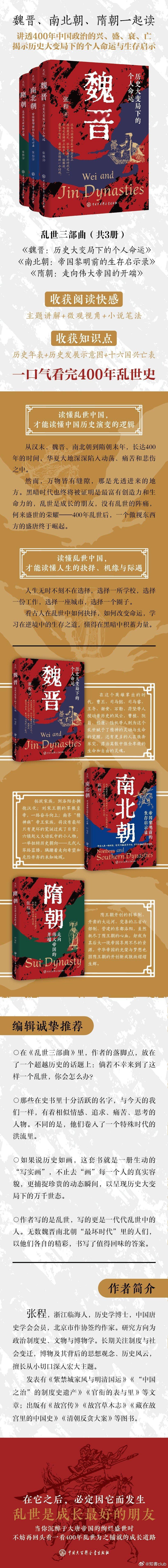 从3世纪初到6世纪后期的三百多年,是大分裂的魏晋南北朝时期。分裂混乱和南北征伐中酝酿着统一,孕育出了随后的隋唐辉煌。魏晋乱世是这段挫折期的前半段,到南北朝达到高潮,最终塑造了中国历史的永恒记忆。