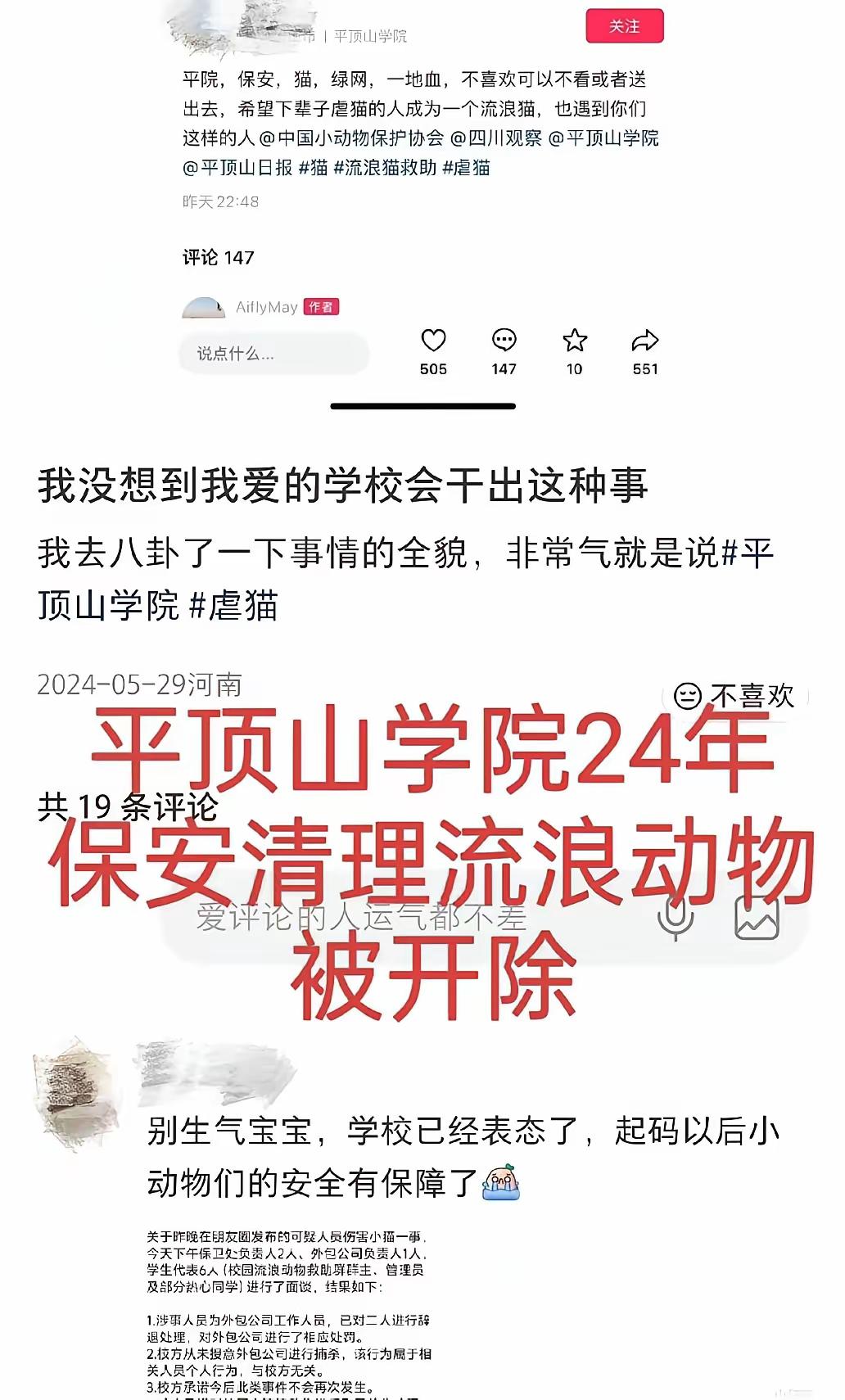 平顶山学院2024年开除了清理流浪猫的保安,结果两年后,前几天一个女生被流浪狗咬得不轻,结果网络声音都在嘲笑是前人砍树后人暴晒的回旋镖。