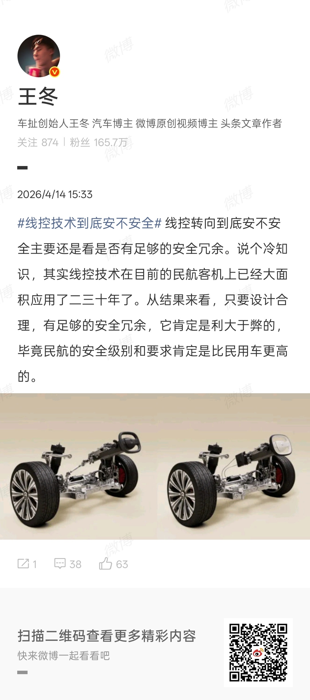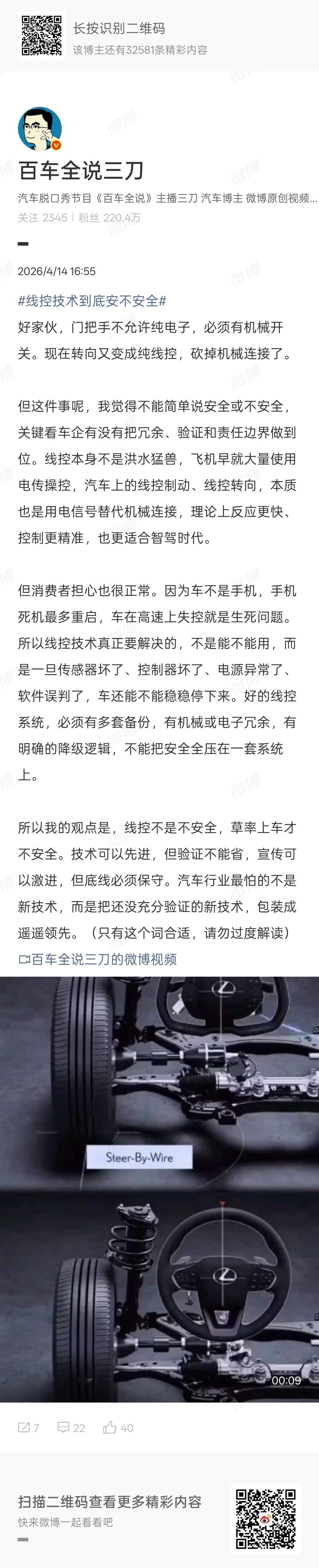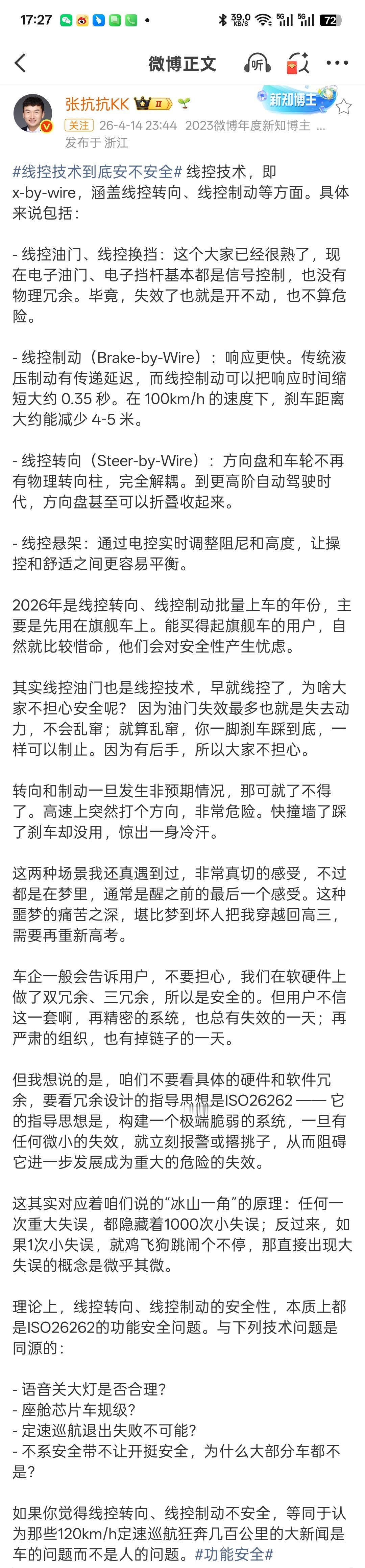 博主深入普及线控油门、线控制动、线控悬架等不同线控技术的具体含义,同时表示“如果你觉得线控转向、线控制动不安全,等同于认为那些120km/h定速巡航狂奔几百公里的大新闻是车的问题而不是人的问题。”