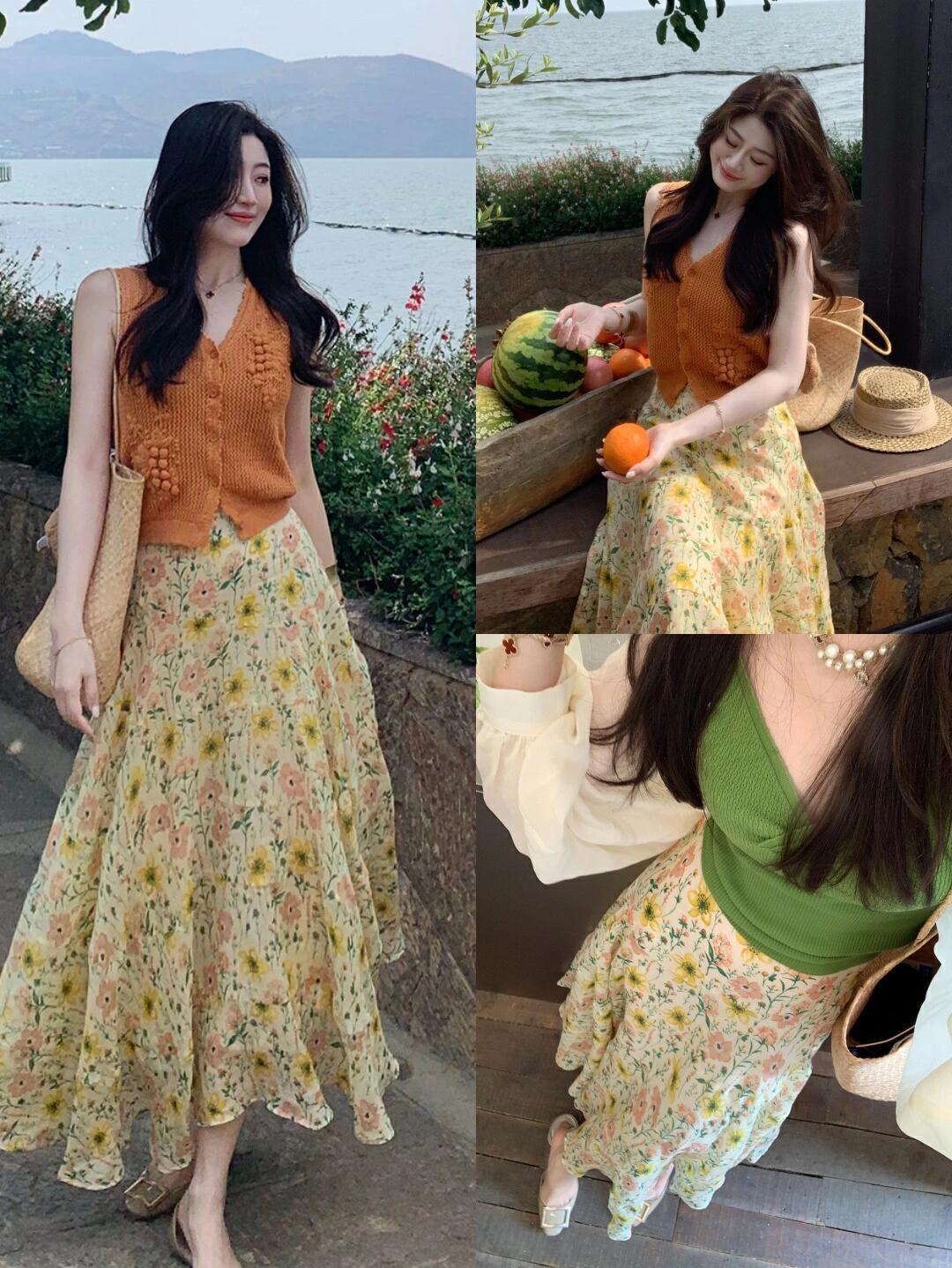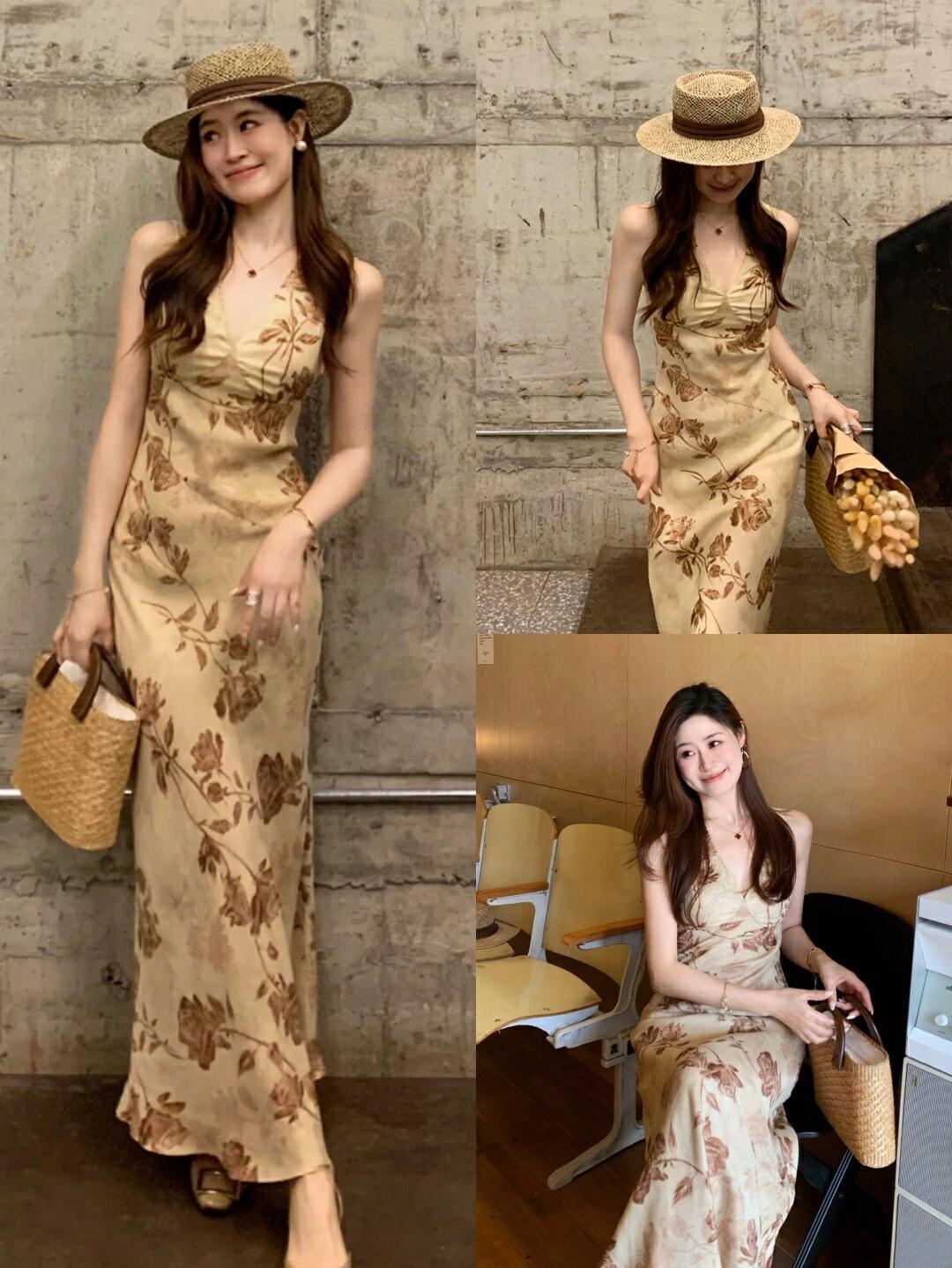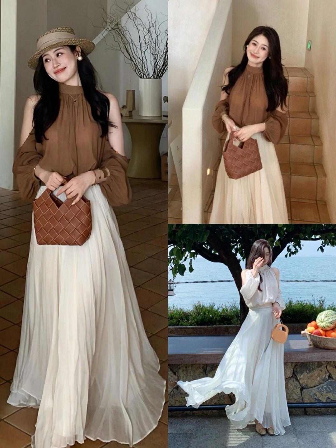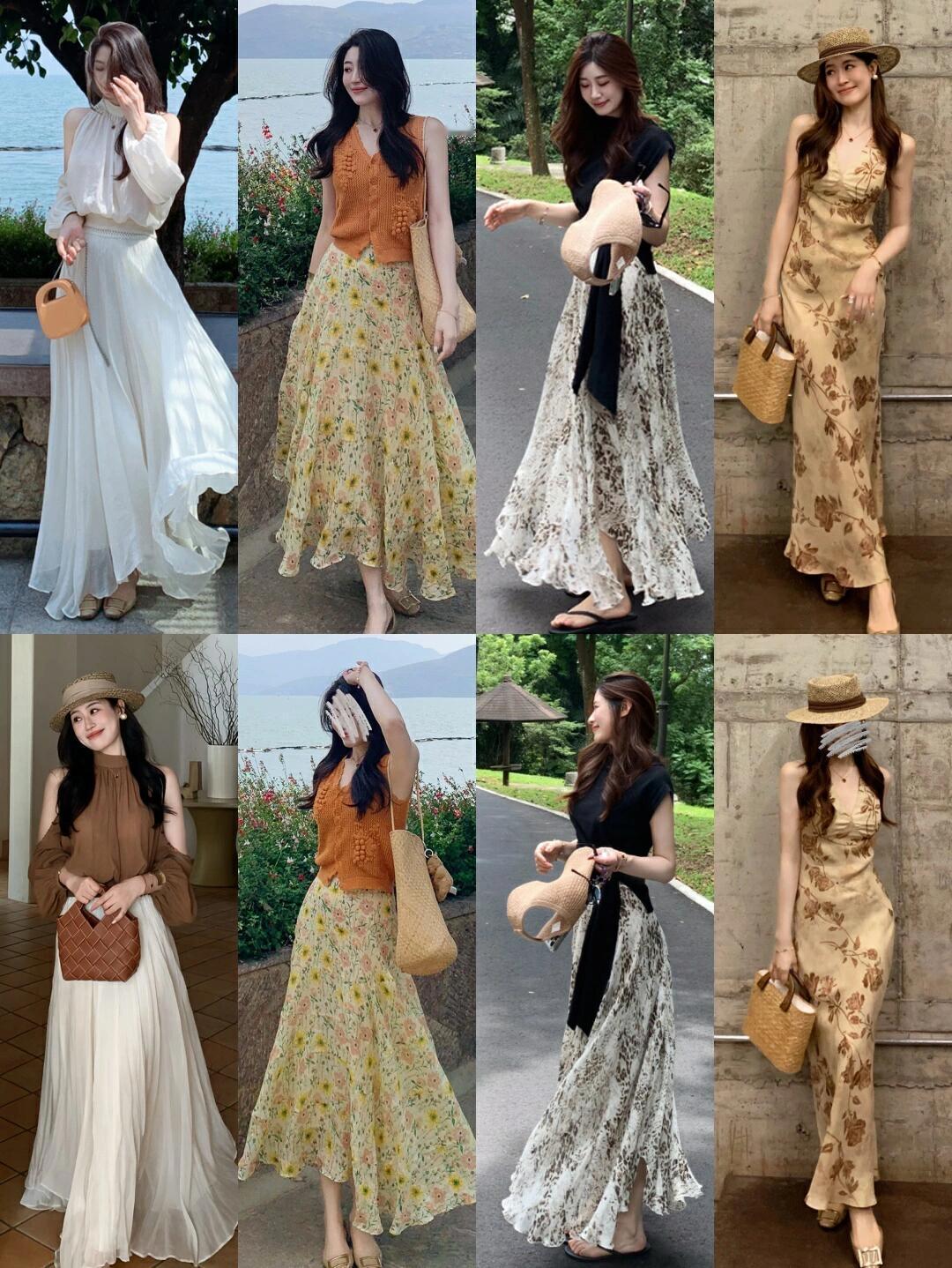 轻盈飘逸的雪纺长裙、碎花半裙和温柔挂脖上衣,搭配草编包与草帽,自带度假般的慵懒气质。低饱和的暖棕、米白与浅黄配色,衬得整个人温柔又有质感,露肩、挂脖和收腰设计恰到好处地勾勒身形,举手投足间都是优雅气质,日常出行或度假都适配,温柔又不刻意,氛围感直接拉满。
