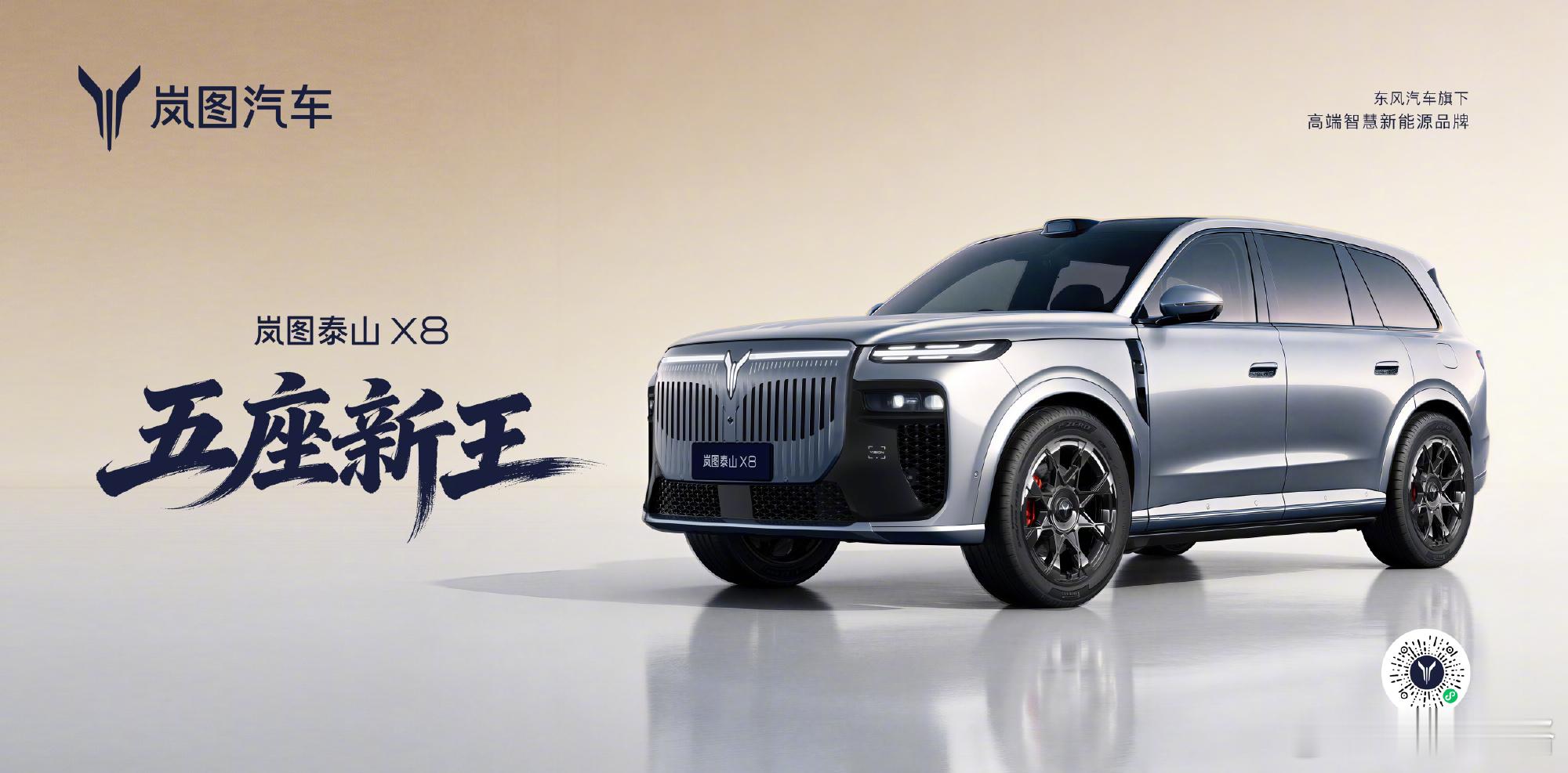 岚图泰山X8车长5200mm、轴距3090mm、车宽2025mm——超大空间,不是吹出来的,是实打实造出来的。6.1㎡座舱、取消第三排把空间全还给车主、纯平地板、双环抱座舱布局、后排双零重力座椅搭配全网首发揉捏式机械按摩——这不只是SUV,更是开着走的私人按摩室。全自动一键成床,随时随地大小睡。随意躺平才是真舒适!不是在堵车,是在包场看IMAX。13L冷暖箱、全场景对外放电、智能健康新风……大到你叫不出名字的配置一车给齐。百变成床、大三座大四座大五座随意切,"移动总统套房"这句话,泰山X8是真的能做到。华为最新一代鸿蒙座舱,四颗激光雷达保驾护航,五座新王,非它莫属!
