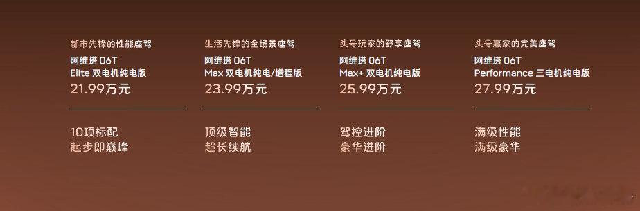 阿维塔06T权益后到手价21.59万起,今日24点前下定,可享3000元意向金权益。阿维塔06T不是妥协后的"入门款",而是把原创设计、巅峰性能和顶级智能辅助驾驶通通为你打包到位的诚意之作。