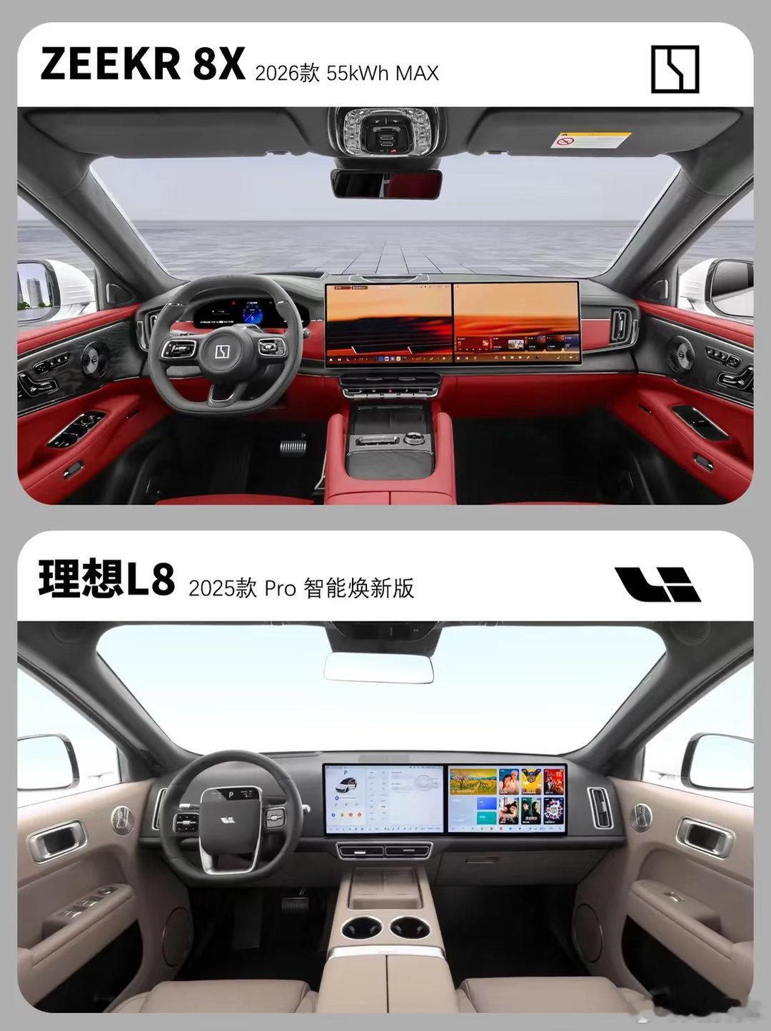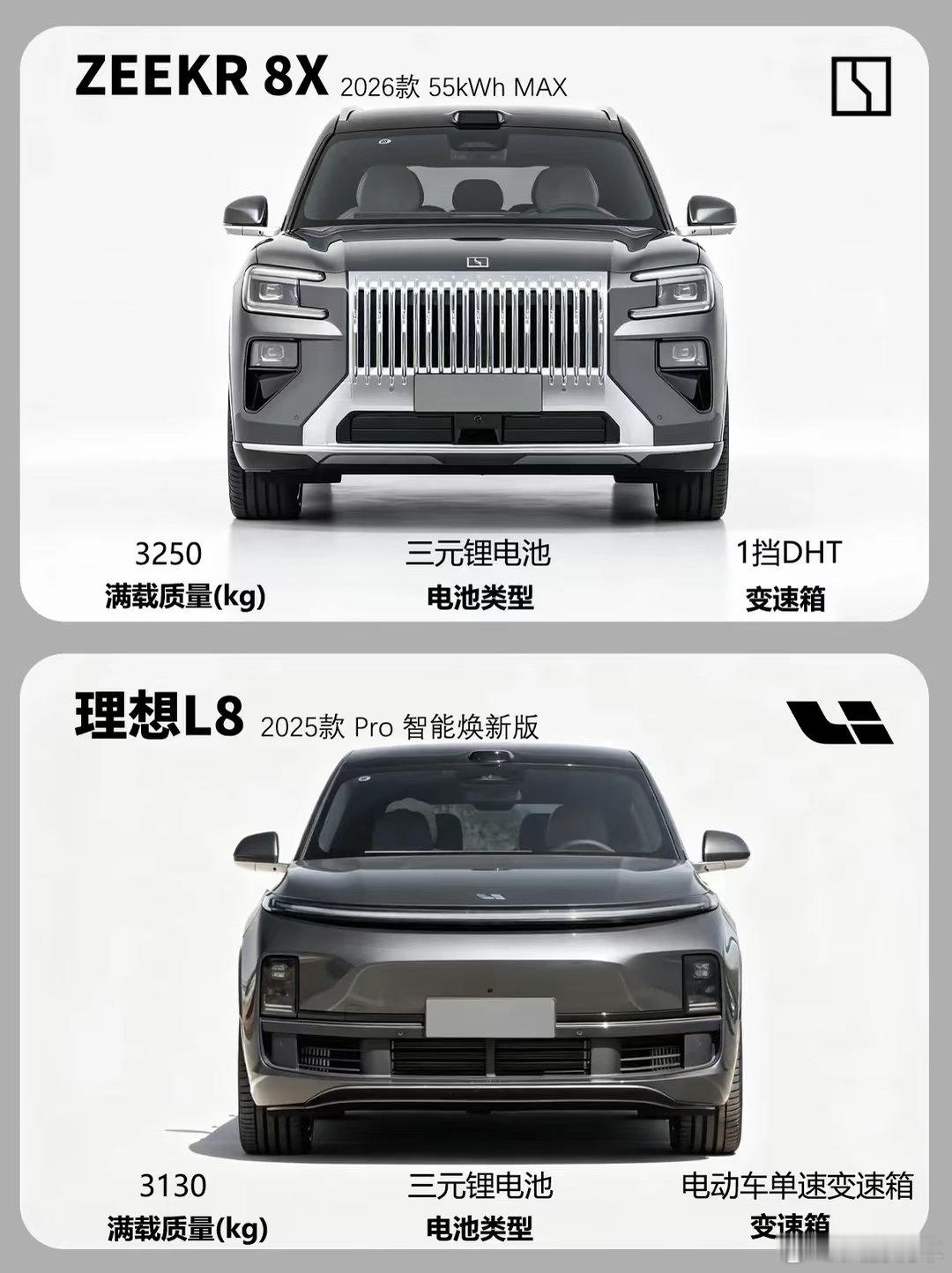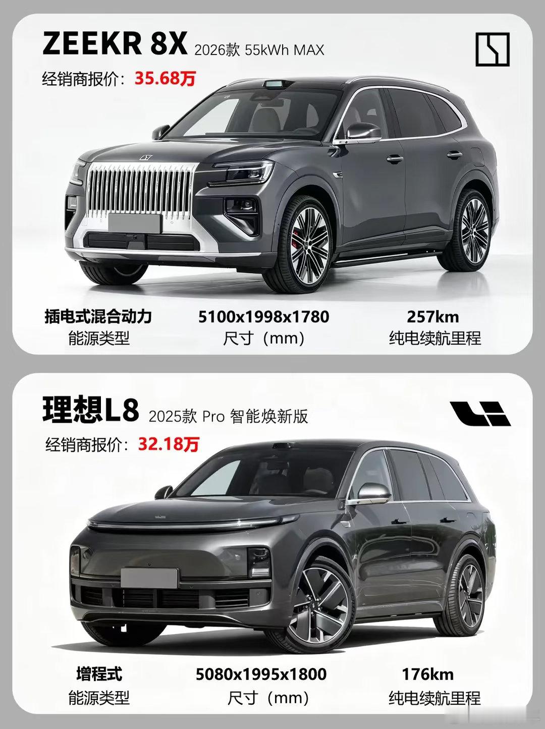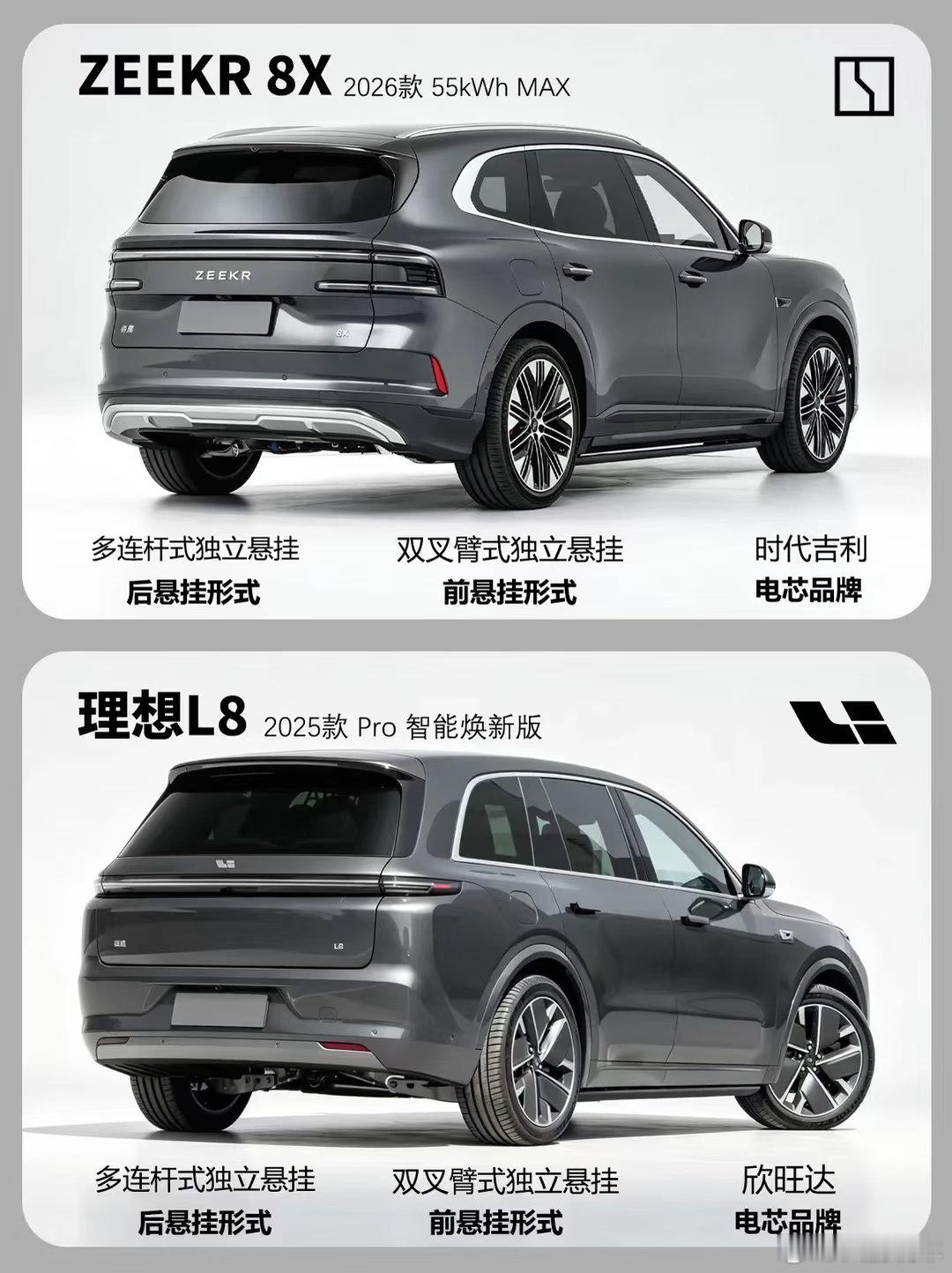 同属中大型家用 SUV,极氪 8X 和理想 L8 的对决看点十足。价格上,理想 L8 Pro 焕新版 32.18 万,极氪 8X 55kWh MAX 35.68 万,前者门槛更低。动力方面,极氪 8X 插混架构带来 935N・m 峰值扭矩,远超理想 L8 的 620N・m,纯电续航也以 257km 领先 176km。底盘均为双叉臂 + 多连杆,调校风格各有侧重。空间上,极氪 8X 车长和轴距略占优势,两车都主打大空间家用场景。内饰风格迥异,极氪偏运动豪华,理想则延续家庭舒适取向。整体来看,理想 L8 胜在价格亲民、增程路线成熟;极氪 8X 则以更强动力和纯电续航,适合追求性能与操控的用户,按需选择即可。玩车无格式 RCC飞驰计划 汽车圈观察者 汽车推荐 极氪8x 理想L8 suv 新能源