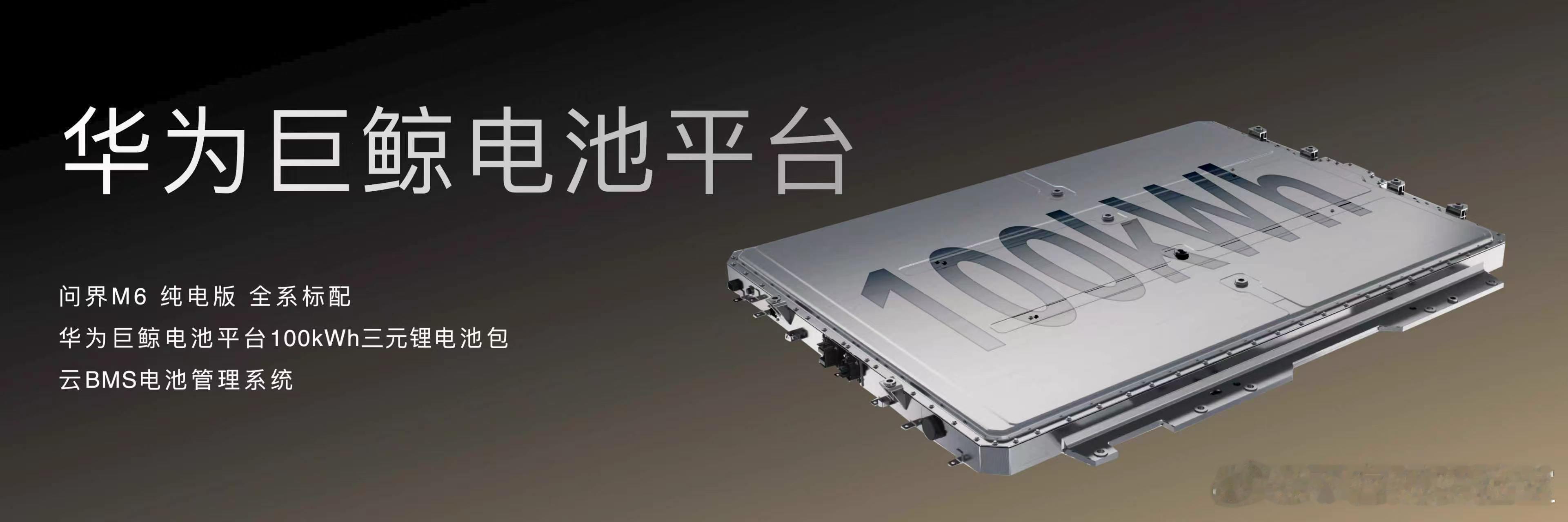鸿蒙智行发布会 问界M6搭载华为巨鲸电池平台,纯电版全系标配100kWh三元锂电池包,云端BMS电池管理系统。问界M6纯电版CLTC续航里程至高760km,让每个远方都无需焦虑;增程版CLTC综合续航至高1605km,CLTC纯电续航至高355km,百公里油耗低至5.9L,让每个终点都安心抵达。鸿蒙智行新品标配华为巨鲸电池平台