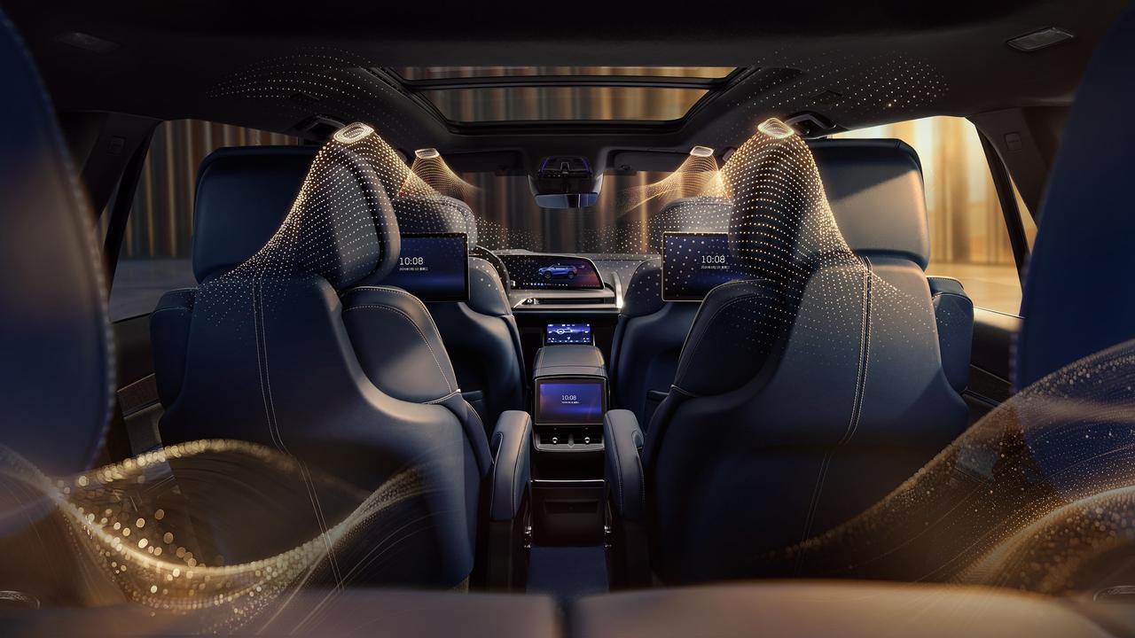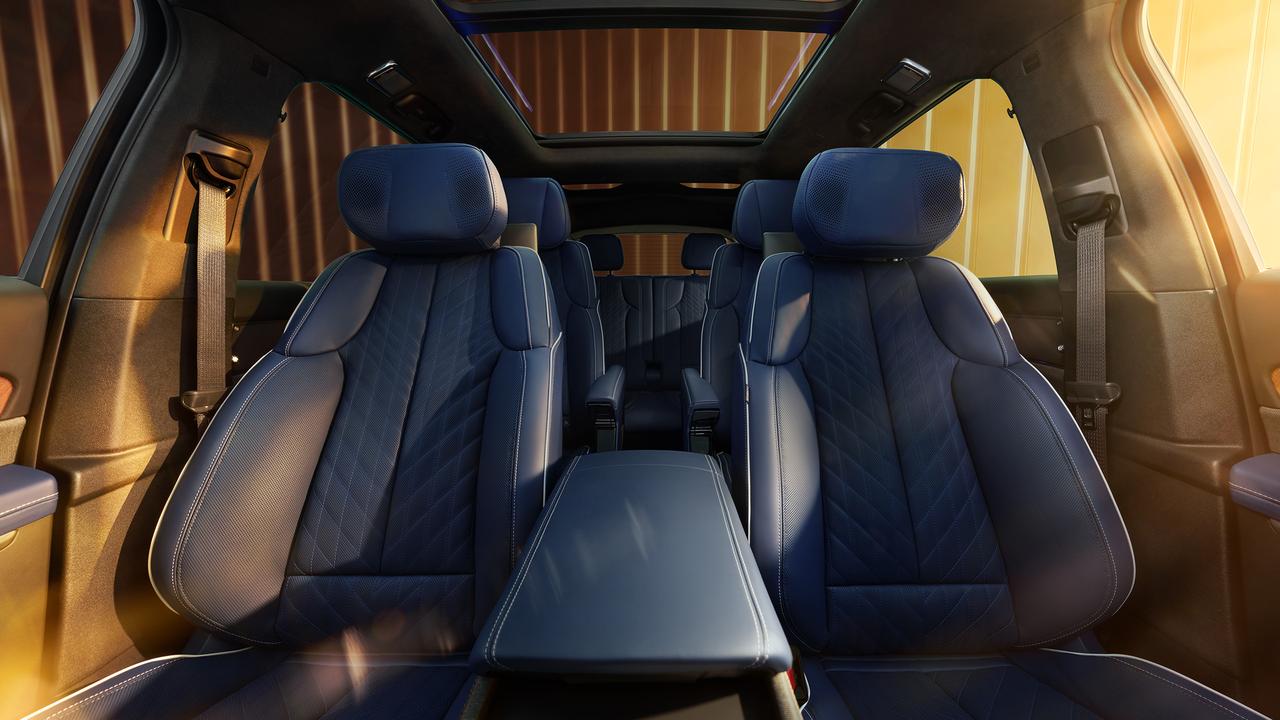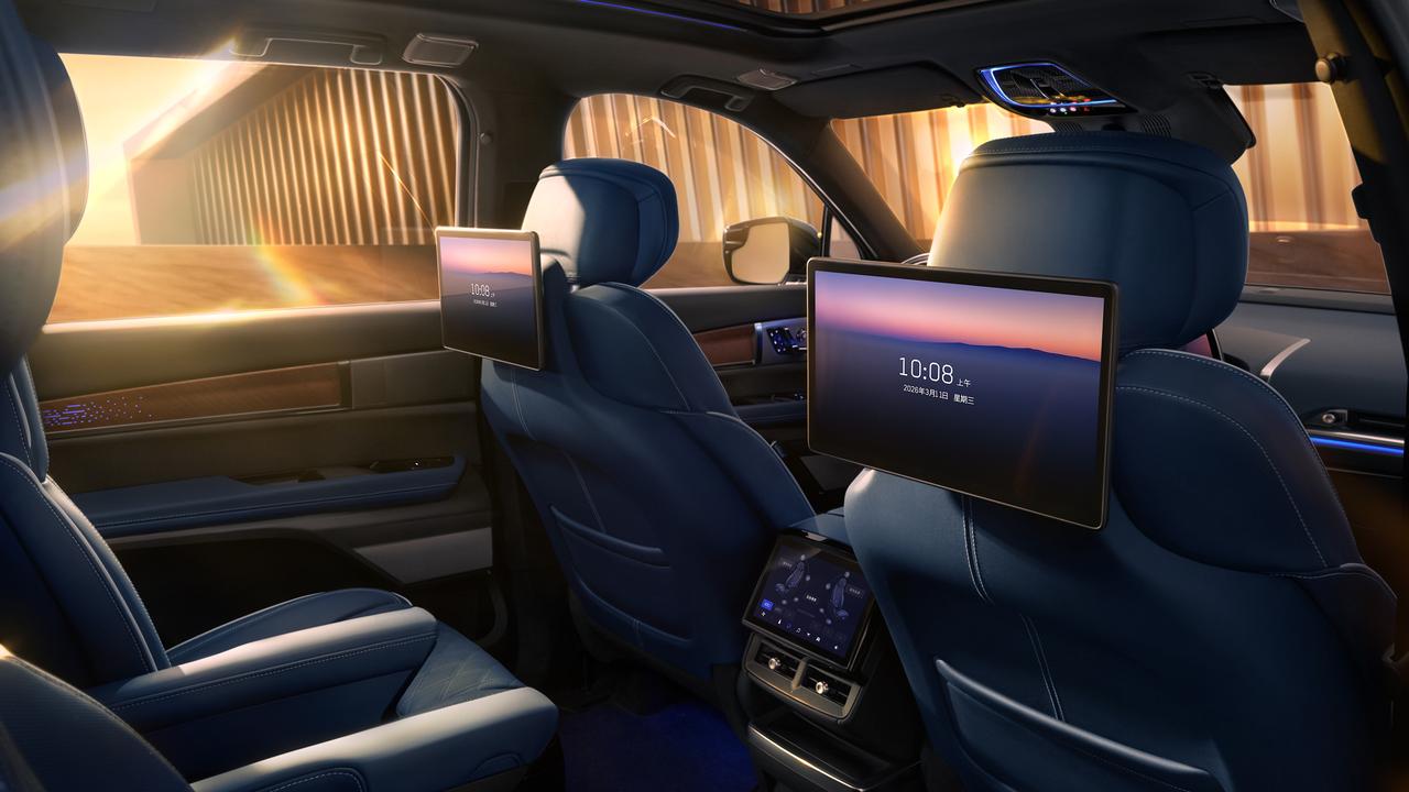 车里更不用说了,六座布局,二排带8英寸控制屏和娱乐屏,33英寸曲面连屏、23扬声器AKG音响,连门板上的座椅按键都做得跟艺术品似的,美式豪华依然底蕴十足。动力也不含糊,双电机四驱805牛·米,3.75秒破百,还带后轮转向,都是顶级配置。