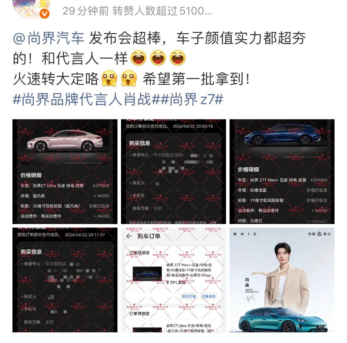 肖战粉丝太有实力了我勒个几十万的单子说下就下,一个一口气2台,一个一口气3台尚界z7肖战尚界预定数量 鸿蒙智行发布会