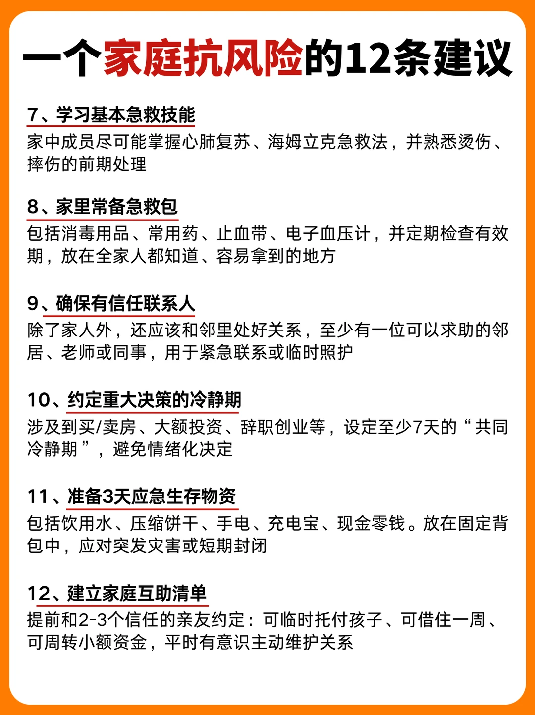一个普通家庭抗风险的核心,除了家庭成员和睦、有一定的可支配资金、懂得急救技能外,还有非常重要的一点,要学会提前布局、配置保障,防范风险!