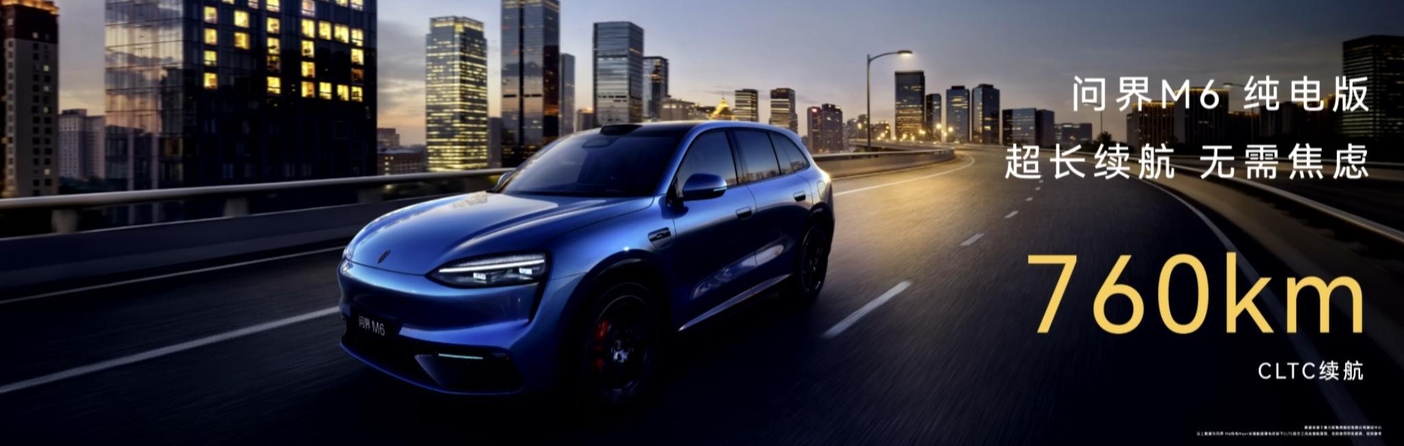 问界 M6 纯电版全系标配华为巨鲸电池平台 100kWh 三元锂电池包,CLTC 续航 760km,增程版综合续航 1605km。