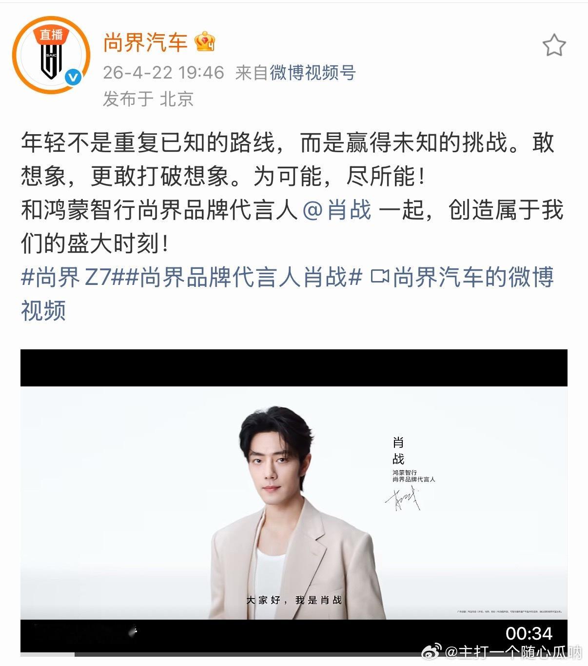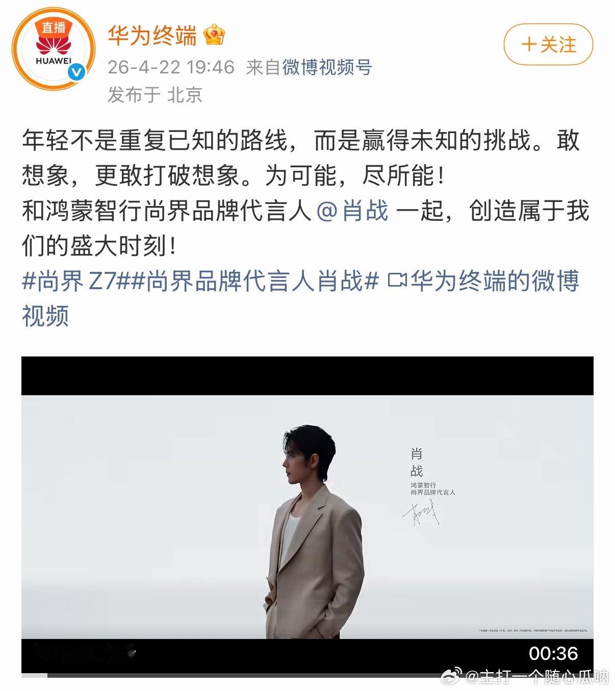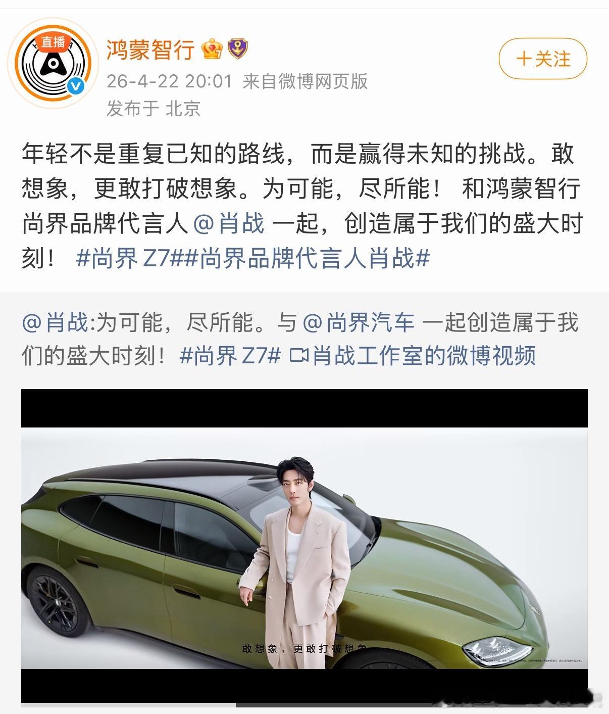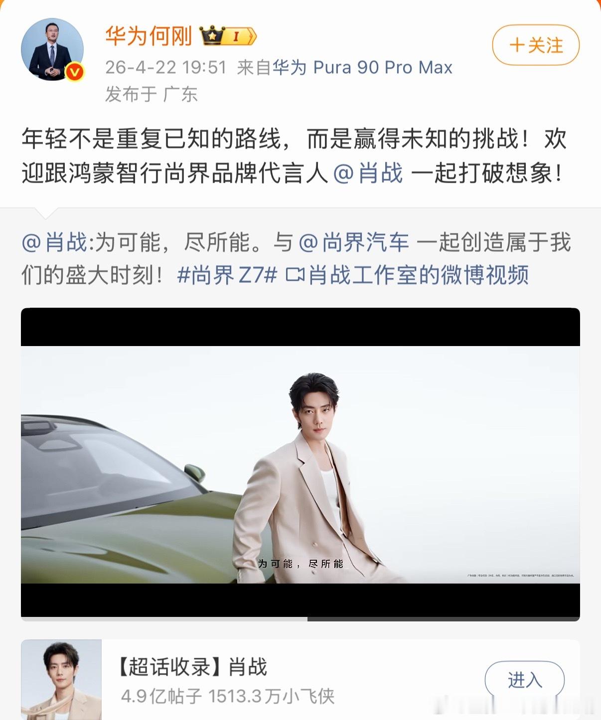 两位老总和品牌账号火速转发肖战的视频鸿蒙智行发布会