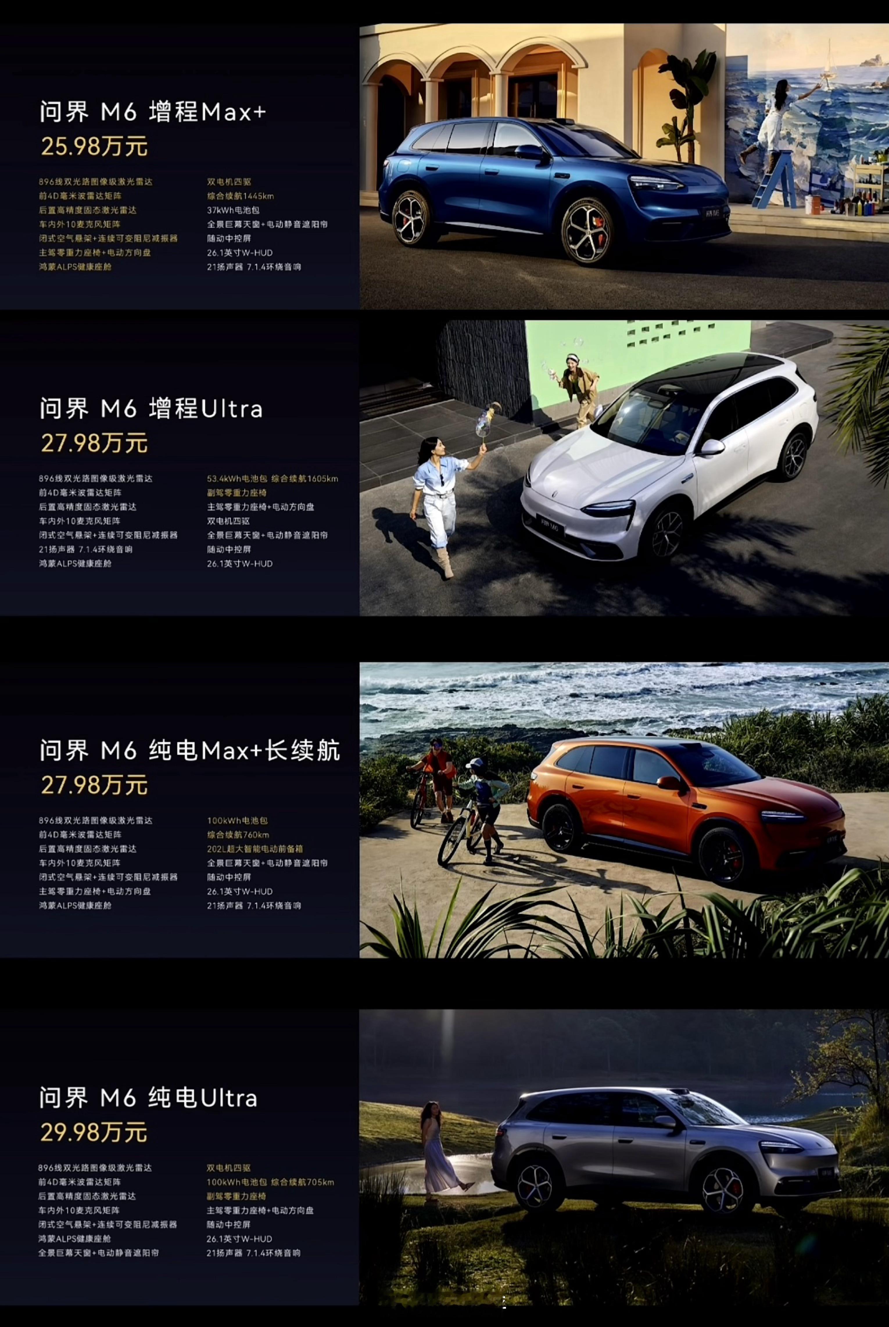 华为鸿蒙智行发布会问界M6增程Max+,25.98万元问界M6增程Ultra,27.98万元问界M6纯电Max+长续航,27.98万元问界M6纯电Ultra,29.98万元问界M9,预售价格49.98万元起问界 M9 Ultimate领世加长版,预售价格66.98万元起