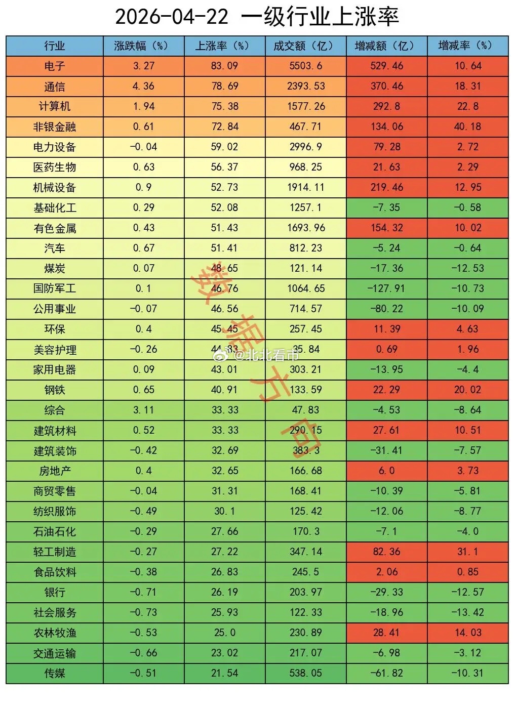 电子、通信、计算机,占据榜单前三位,前两者的涨幅分别为3.27%和4.36%