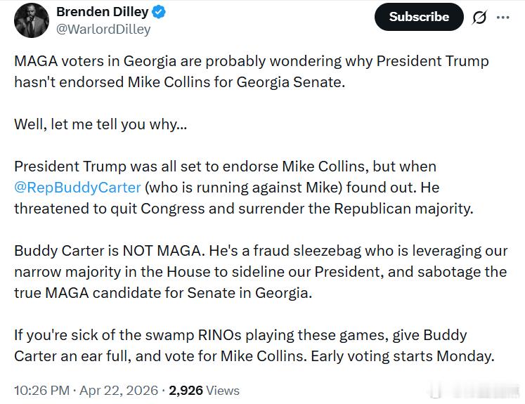 原本,特朗普总统已经准备好为迈克·柯林斯背书了,但当巴迪·卡特(他正在与迈克竞争)得知此事后,威胁要退出国会,并放弃共和党在众议院的多数席位。
