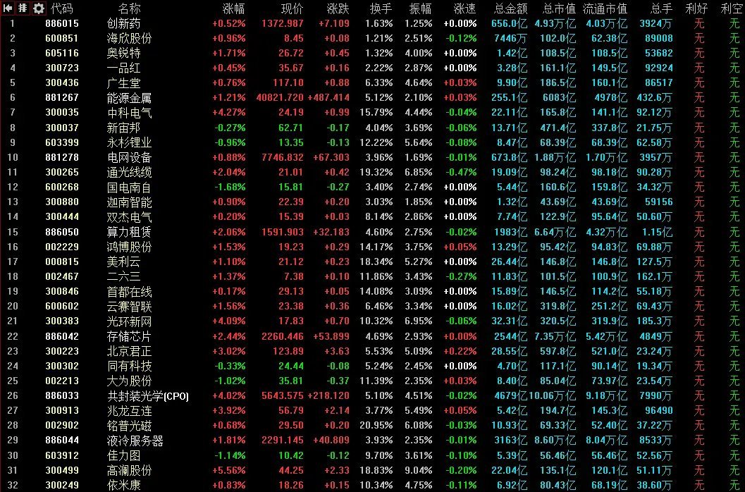 4月23日A股策略:中办、国办联合发文!利好一板块周四将领涨!专注A股每日实战操作,助力散户投资不迷路!若你并非长线投资者,想在A股稳健生存,一定要牢记:周密布局只是良好开端,严格操盘纪律才能收获盈利果实!一、大势研判周三A股放量反弹,成交量放量1500亿至2.58万亿。技术面上,大盘依托5日线与60日线稳步上行,节奏虽缓但走势扎实,目前已站稳4100点整数关口,逼近2月平台压力位。连续反弹后市场获利盘累积,叠加上方套牢盘压力,林哥认为,短期大盘大概率在当前区间横盘震荡,回调空间有限,下方20日线与60日线支撑难以轻易跌破。二、盘面跟踪周三沪深两市个股涨多跌少,上涨2900家、下跌2400家,涨跌比例接近,指数存在一定失真。板块方面,经过两日蓄势后,以CPO、光纤为首的AI算力硬件全线走强,通信设备、先进封装、存储芯片、PCB等板块涨幅居前;AI应用、零售、农业等防御方向表现偏弱。近期主线热点集体回暖,就连前期走势最弱的创新药,周三涨幅也与大盘同步,市场整体格局较为健康。三、消息面跟踪1. 中央办公厅、国务院办公厅印发《关于更高水平更高质量做好节能降碳工作的意见》,明确统筹节能降碳与能源绿色转型。2. 4月22日,共青团中央、中央网信办、国家发改委等15部门联合发布《关于深化青年发展型城市建设 助力建设现代化人民城市的意见》。3. 当地时间22日,伊朗议会国家安全委员会成员马利基表示,美国对伊朗实施海上封锁、袭击船只及持续施压威胁,导致伊朗谈判团队未赴伊斯兰堡参与伊美第二轮谈判。四、市场资金面周三机构与游资操作出现分歧:机构买卖盘同步放大,但卖盘力度更强,资金净流出有所增加;游资买盘保持稳定,卖盘大幅缩减,呈现净流入态势。板块资金流向来看,双方在主线热点上仍未形成合力:机构小幅加仓锂电池,中幅减仓CPO,小幅减仓化工;游资则小幅加仓商业航天。由于机构与游资未大规模向其他板块调仓,短期市场暂难出现新的主线热点。