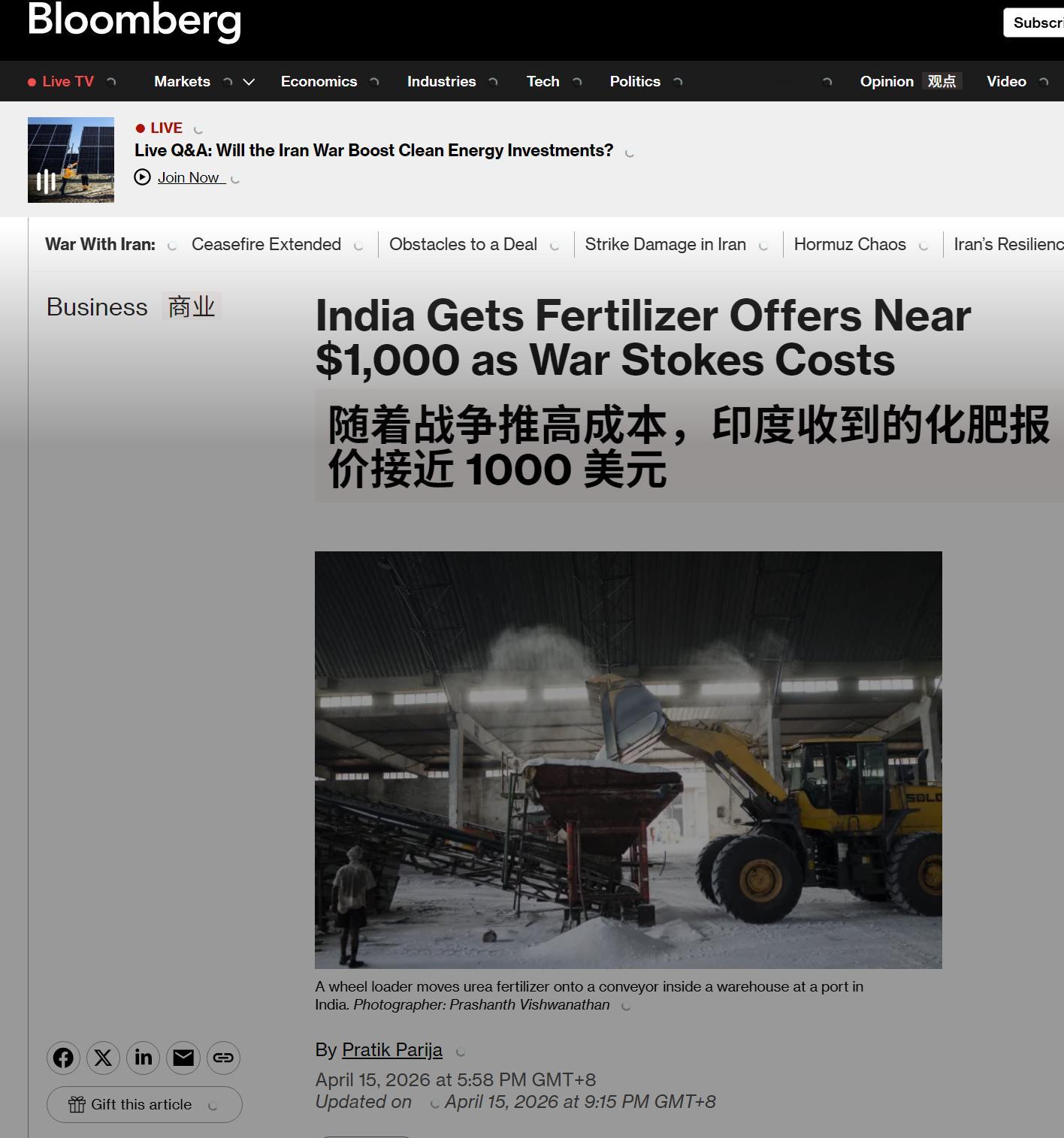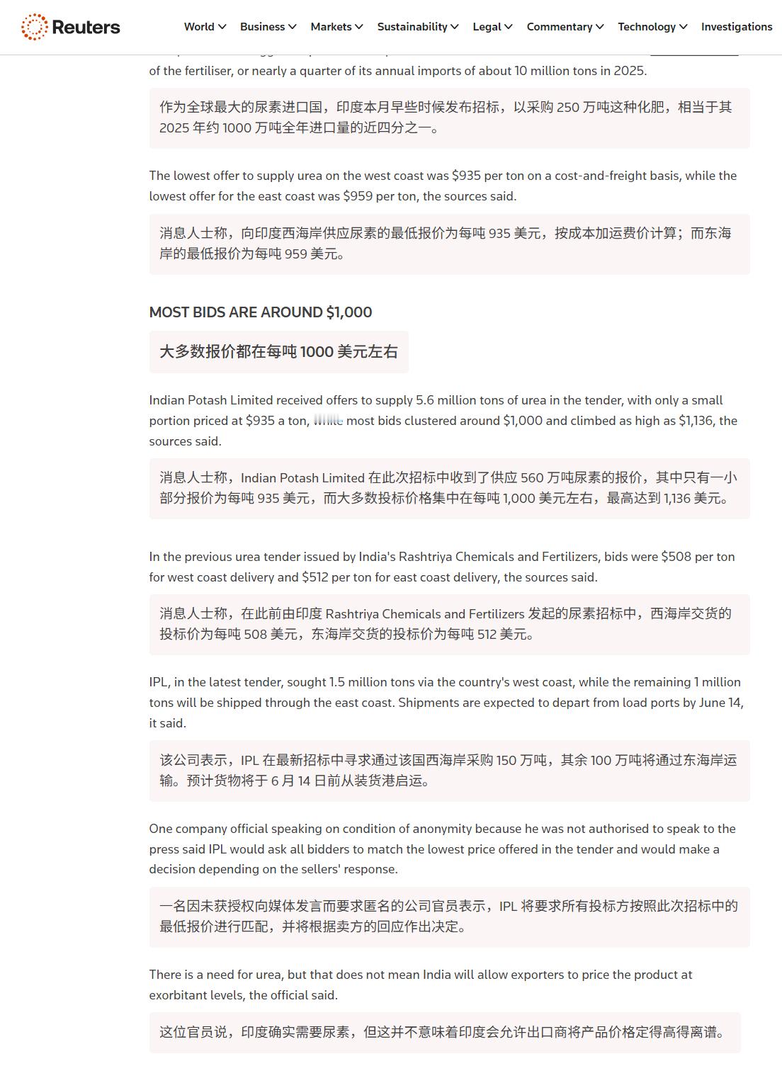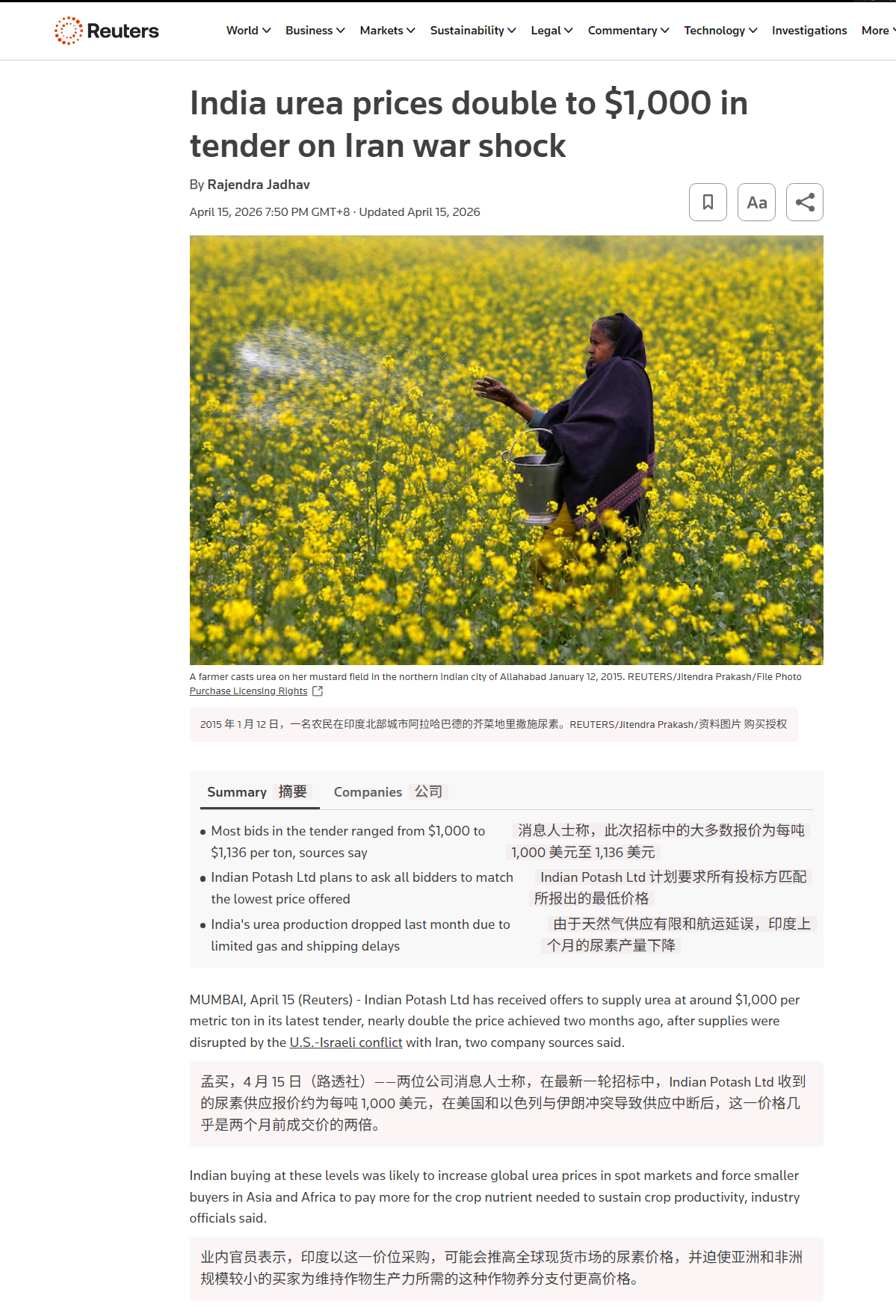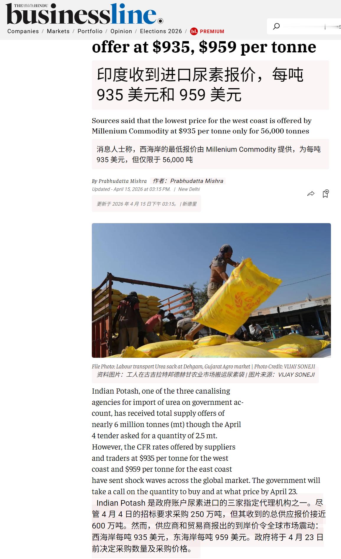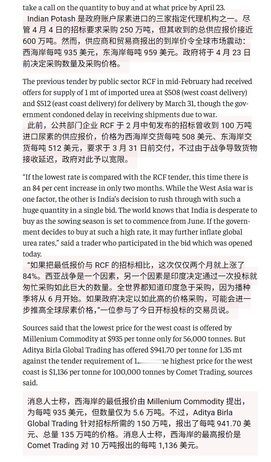 🔻路透社、彭博社、thehindubusinessline 报道:印度将以伊朗冲突前的近两倍价格购买化肥。🔻随着伊朗战争推高成本,印度收到接近 1000 美元的化肥报价,为印度政府进口农作物肥料的印度钾肥有限公司同意以每吨935美元的价格购买150万吨肥料,在西海岸地区交付;另外100万吨将在东海岸交付,单价为每吨959美元。这些报价比印度在冲突爆发前在招标中所同意支付的价格高出近90%。🔻消息人士称,伊朗战争爆发以前,由印度 Rashtriya Chemicals and Fertilizers 发起的尿素招标中,西海岸交货的投标价为每吨 508 美元,东海岸交货的投标价为每吨 512 美元。卢拉调侃赶紧给特朗普颁奖受困霍尔木兹船员2万果蔬补给吃20天海外新鲜事中东现场直击