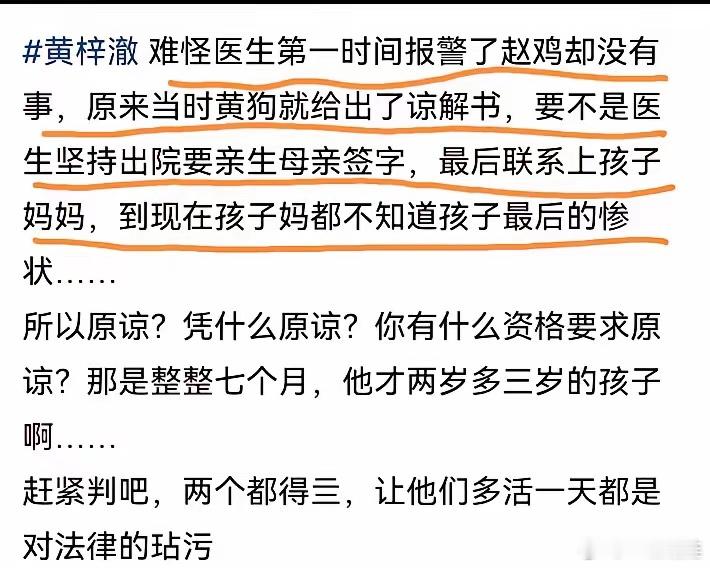 正是因为有这位急诊科夏医生报的警,并坚持要黄梓澈亲生母亲到场签字才可以拔管,要不然可能马女士至今都不知道自己的儿子在哪里,也不会为儿子申冤,而凶手赵某估计还在逍遥法外。亲生父亲黄某更没有一点悔意,因为他不爱这个孩子,也不管孩子的死活,只在乎他给赵某的六万多块彩礼钱,当医生报警后,他居然还出了谅解书,不想让赵某被追责,护着赵某。真没想到人会恶毒到这种程度,没有一点底线,万幸的是碰到夏医生这样正能量满满的医生,给了马女士给儿子讨回公道的机会。