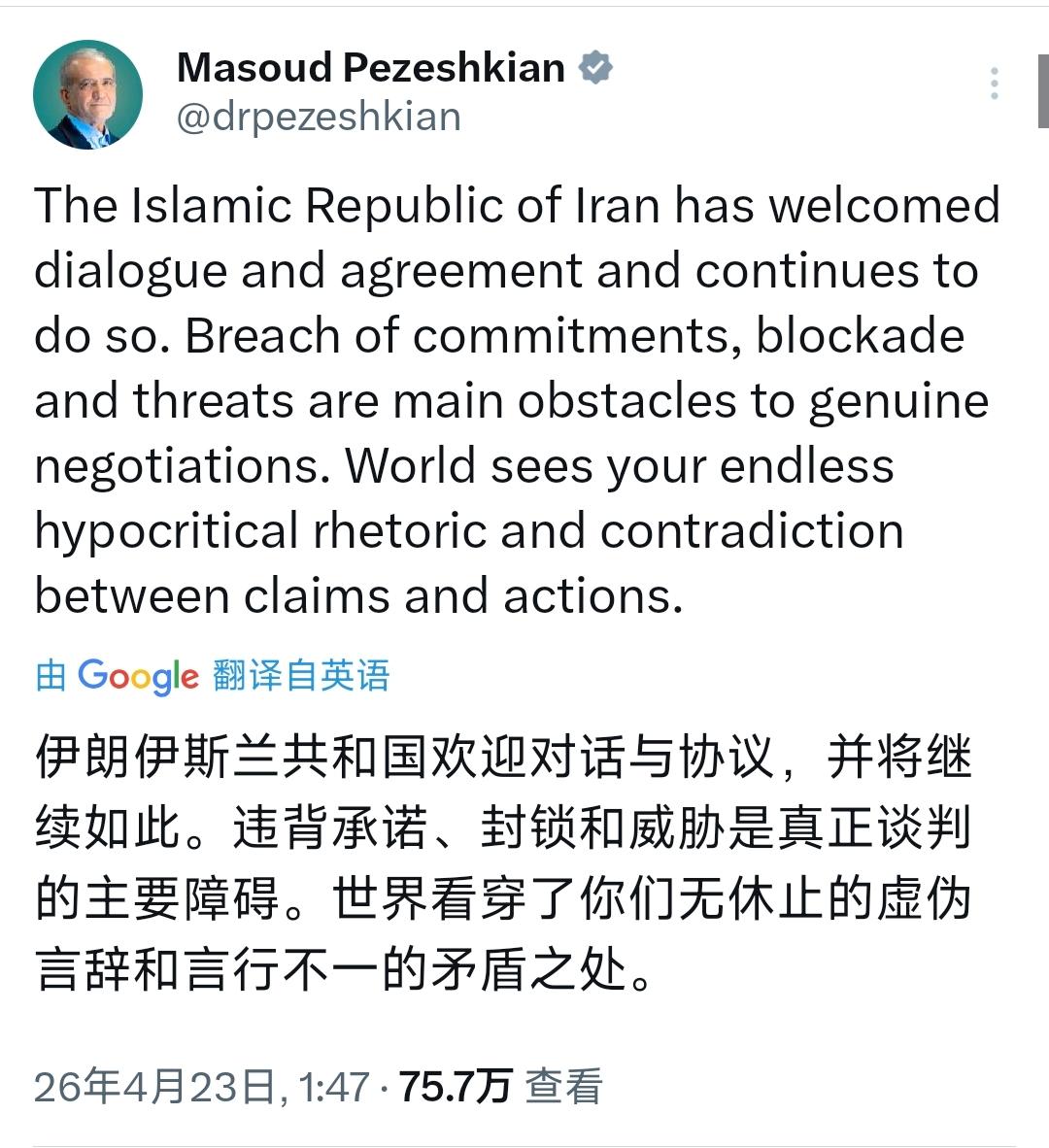 最新发声:伊朗总统佩泽希齐扬今天(北京时间4月23日)写道:“伊朗伊斯兰共和国欢迎对话与协议,并将继续如此。违背承诺,封锁和威胁是真正谈判的主要障碍。世界看穿了你们无休止的虚伪言辞和言行不一的矛盾之处。”