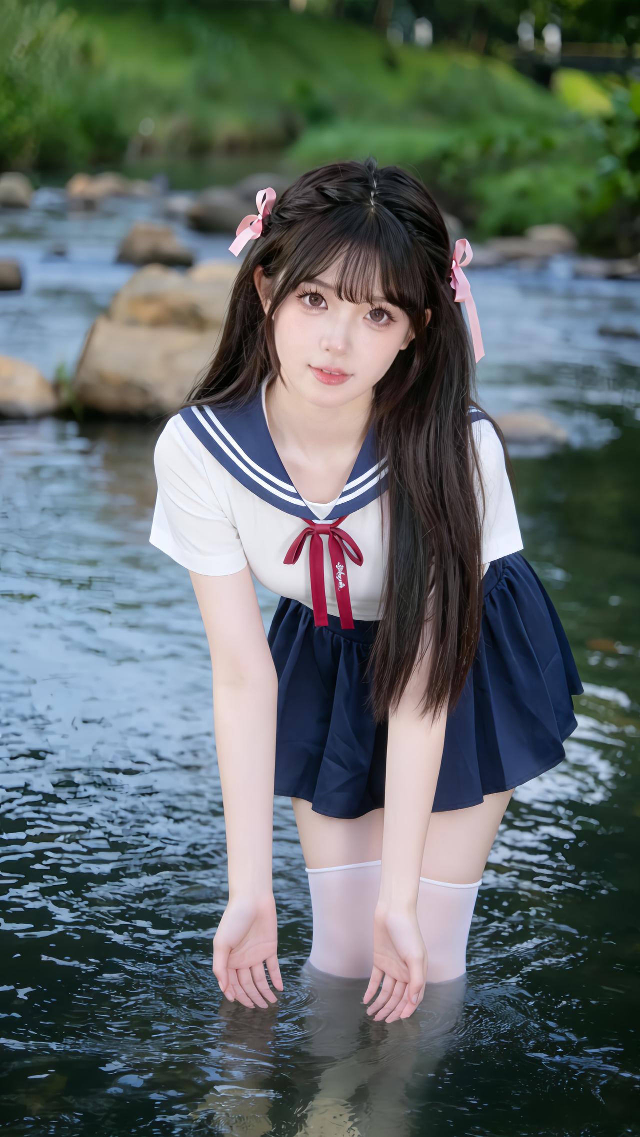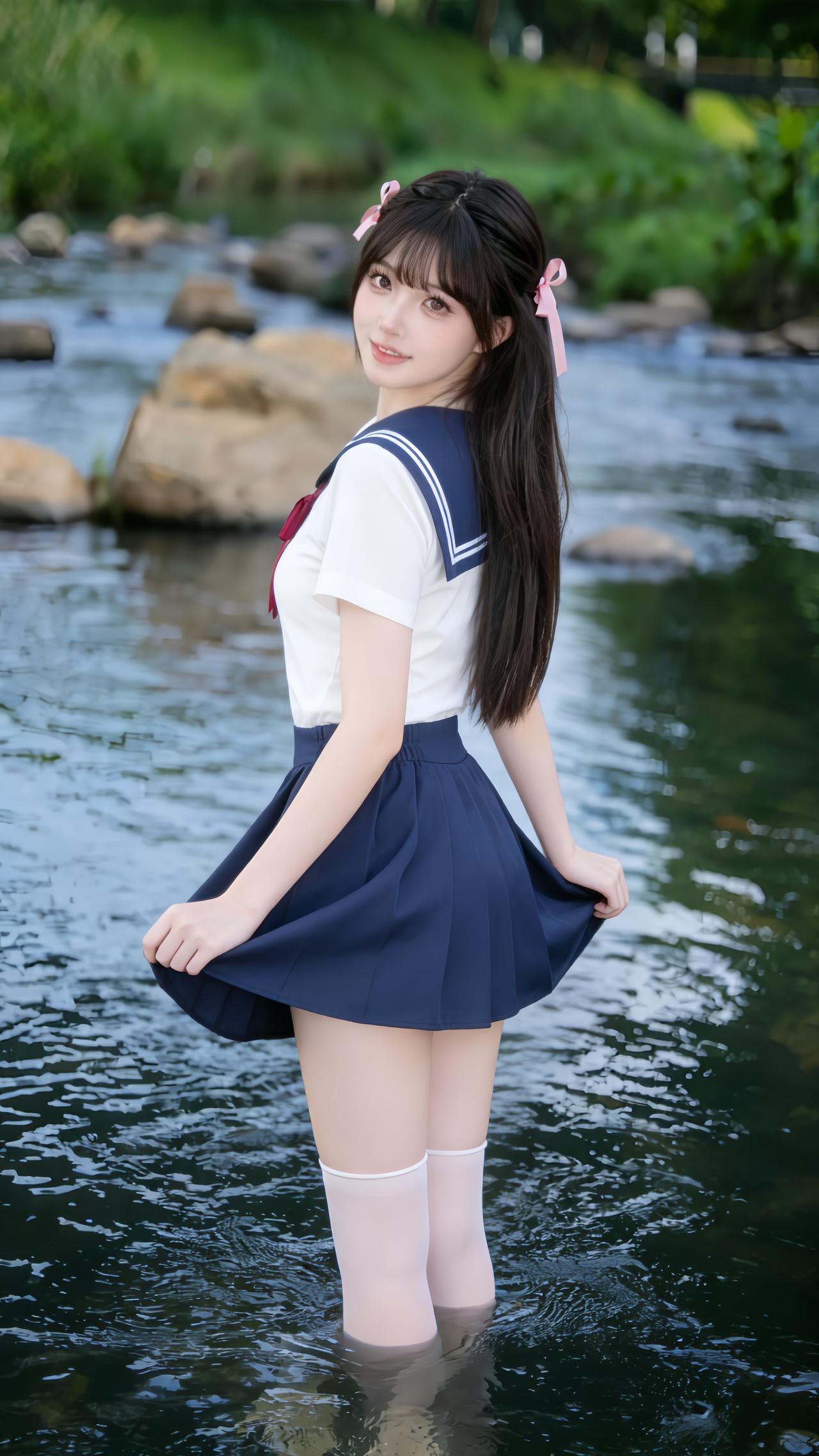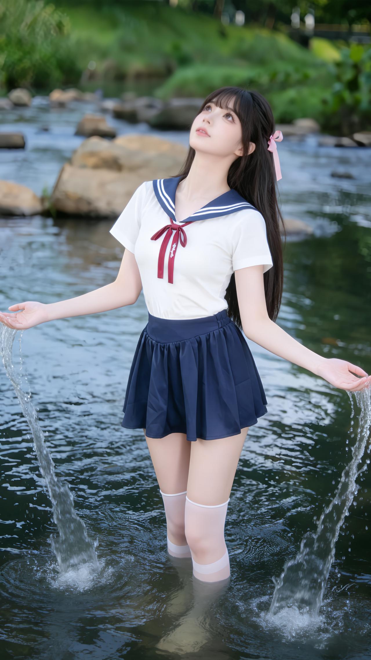清涧溪水潺潺流淌,青石静卧碧波,两岸草木蓊郁苍翠,漾开山野林间的清宁温柔。少女轻坐溪中青石,纯白上衣似林间初绽的茉莉,藏青裙裾如溪水沉淀的幽蓝,清甜水手服与潺潺流水、葱茏绿意温柔相融。溪水漾开细碎波纹,少女眉眼软萌灵动,让JK制服的青春元气与山野溪水的澄澈诗意交织,宛若误入林间溪畔的清甜精灵,满是夏日独有的治愈与温柔。jk青春感穿搭 jk风日常穿搭 jk日系穿搭 jk通勤穿搭 日系水手服穿搭 甜妹水手服穿搭