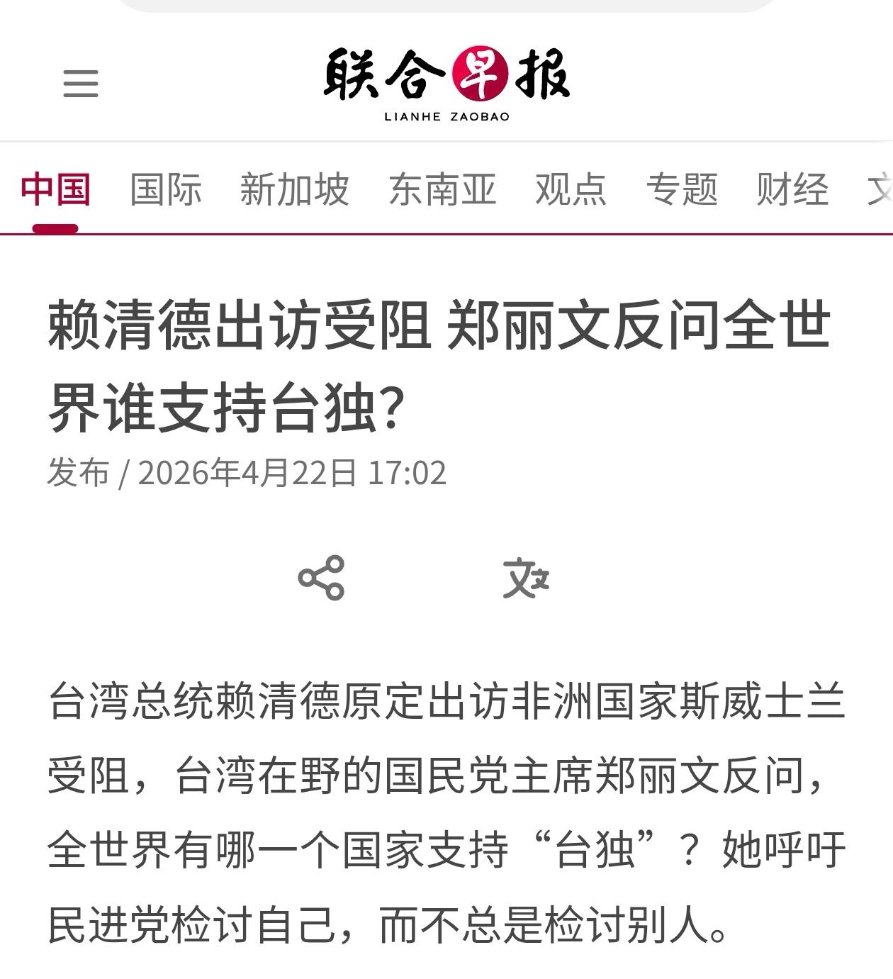 赖清德窜访受阻,中国国民党主席郑丽文在昨天(4月22日)的中常会上批驳民进党当局:“发生这样的事情,民进党当局应该检讨为什么误判形势,误判到出访连落地转机的地方都找不到,究其原因,难道不是民进党整个两岸论述的严重错误?请问赖清德、民进党,全世界有哪一个国家支持‘台独’?全世界都能接受‘九二共识’,不支持‘台独’,民进党为什么一意孤行、一路措败,我们检讨的应该是自己,而不是去检讨别人。”