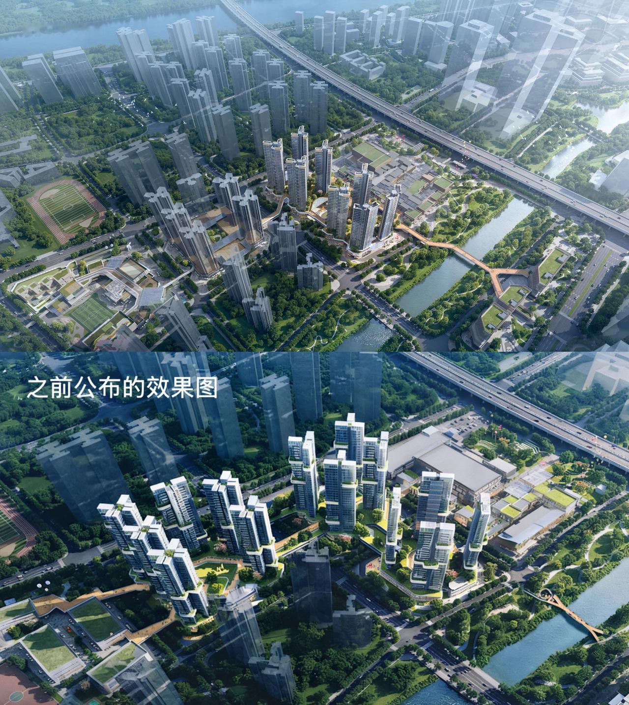 可以看到在最初公布的设计图上,最吸引人的空中花园全部去掉了,无论是楼栋的小花园还是围拢式的空中花园都没有了,变成了普通的住宅风格。另外其中有两栋板楼的楼王,这次也直接改成了塔楼,整体户数有所增加。