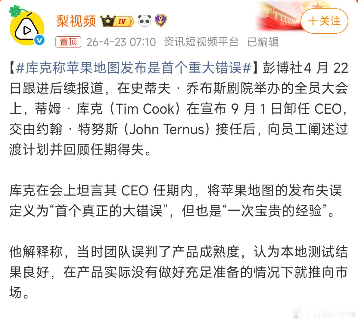库克称苹果地图发布是首个重大错误苹果地图在国内虽然用的数据是高德的,不代表体验就跟高德一样,前端功能少太多。