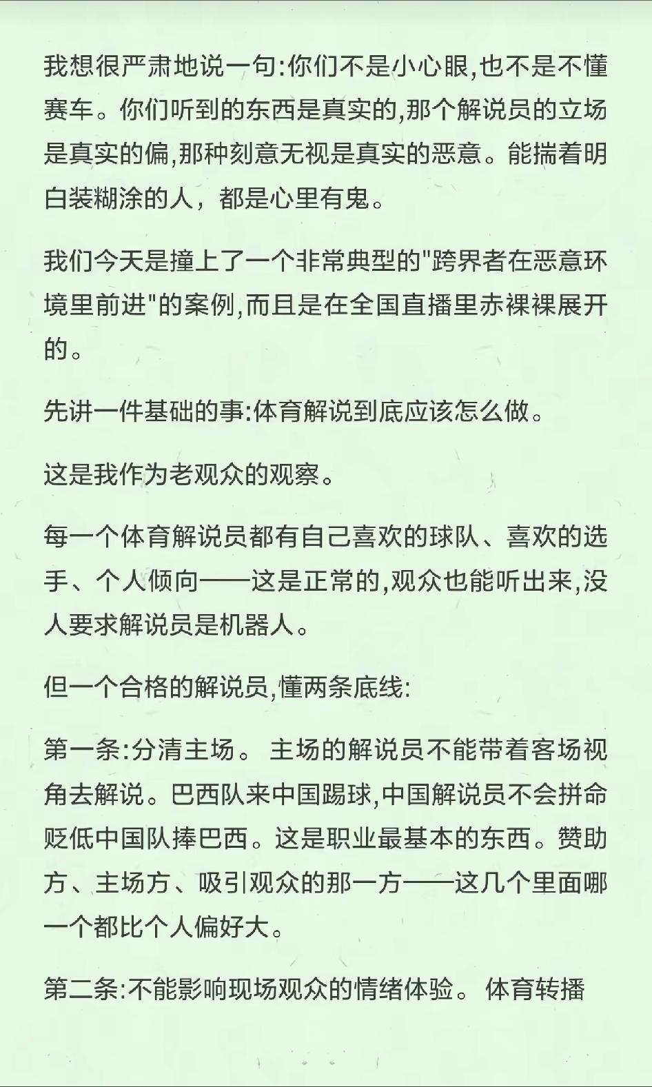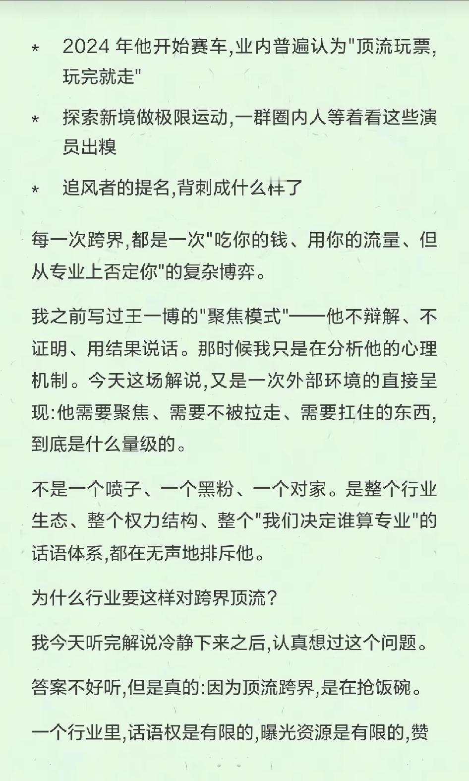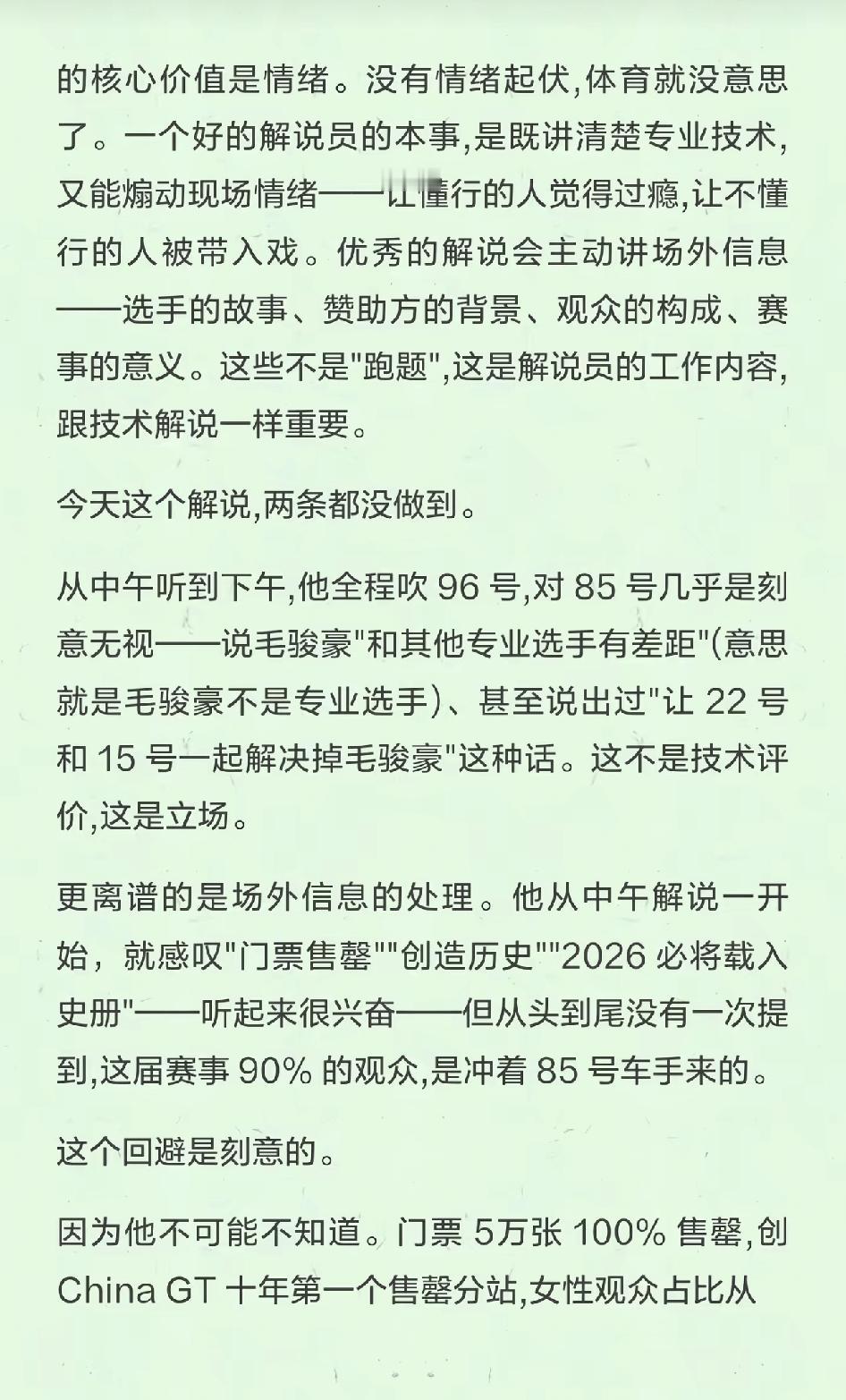 还好就是赛车圈大部分人是正面的态度!那么多专业车手以及专业看赛的路人都纷纷发文质问解说员的不专业性!纷纷发文为王一博发声!同一场CHINA GT国内外解说的差距一目了然!我有点吃了苍蝇一样的反胃![what][what]