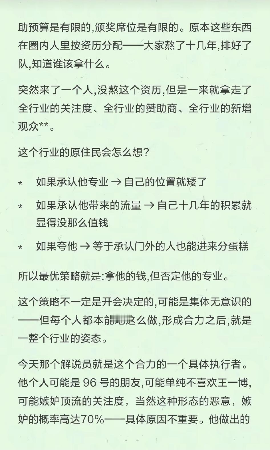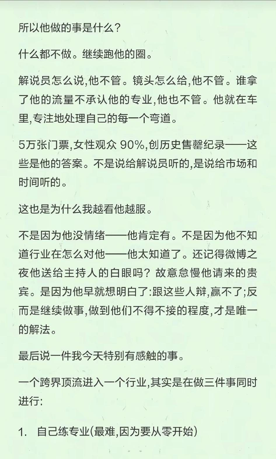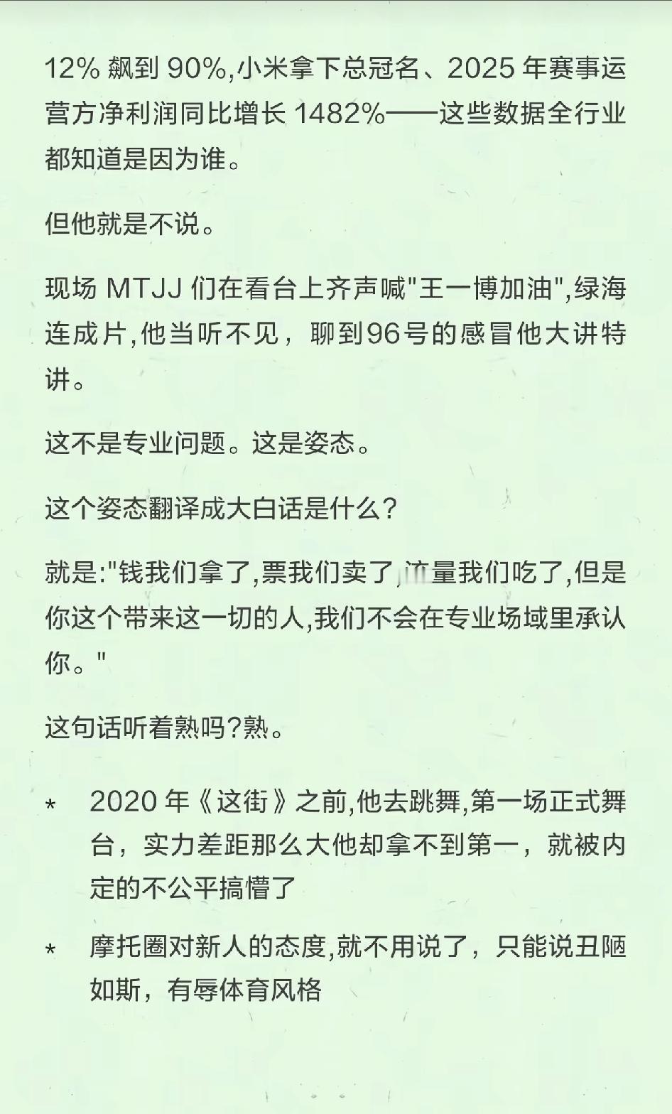 什么时候,人,能真正的没有嫉妒心和红眼儿病呢?什么时候能真正的承认别人的优秀呢!那么难吗?这次赛车王一博28分钟连超6两车的高光转播没画面,解说竟然也没一句解说描述!(我天哪,吃相都不能用难看来形容了!我真的怀疑他主观性避开王一博)!从送票都没什么人看到第一次全场5万+票售罄!看台满满当当都是人,第一次这么大的场面我不信你不知道都是为谁而来的吧!好无语啊![what][what]