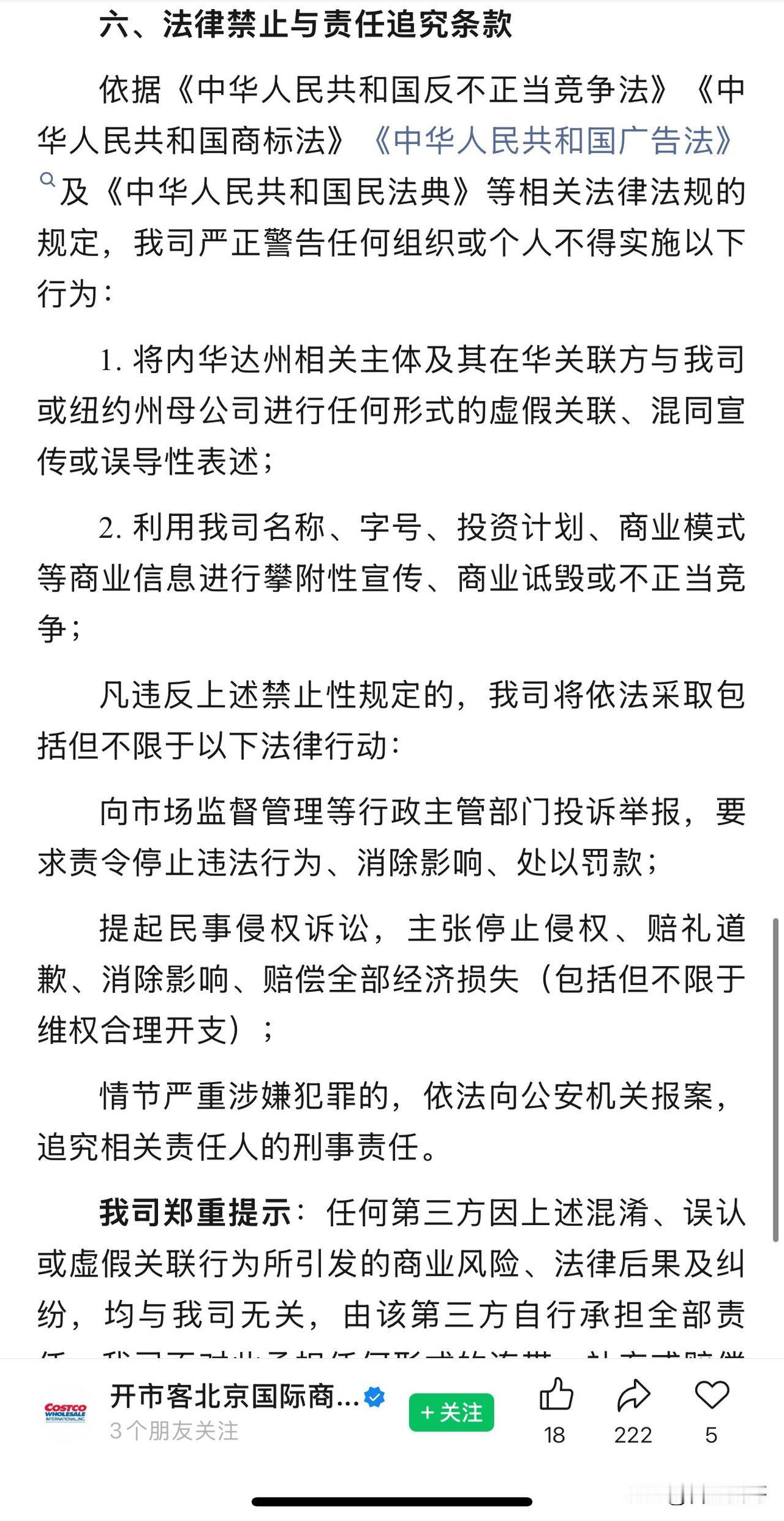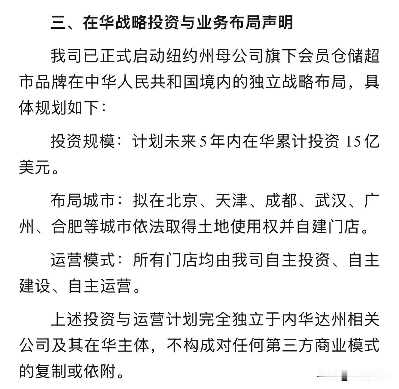 目前开市客北京国际商业发展有限公司,已严正声明。具体规划如下:投资规模:计划未来5年内在华累计投资15亿美元。布局城市:拟在北京、天津、成都、武汉、广州、合肥等城市依法取得土地使用权并自建门店。运营模式:所有门店均由我司自主投资、自主建设、自主运营。