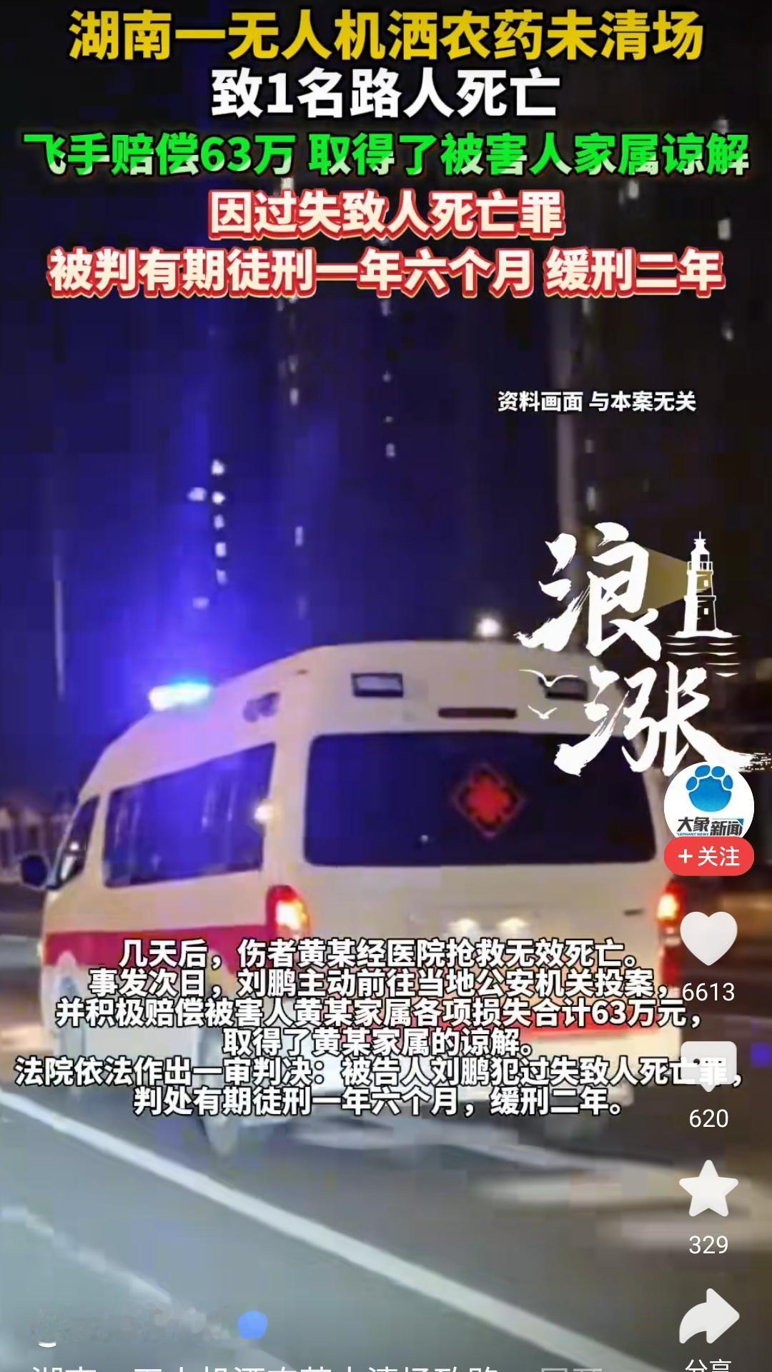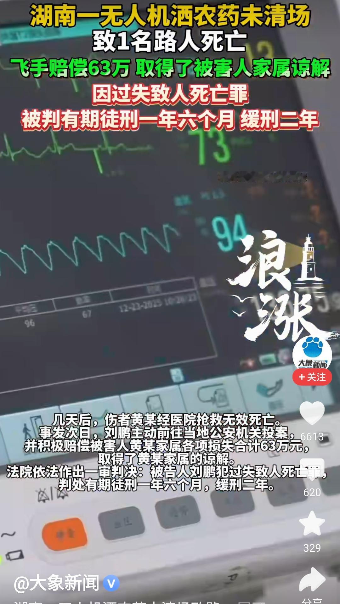 湖南,男子不戴头盔在路上骑摩托车,不小心被旁边撒农药的无人机撞倒了,男子因失血过多离世。无人机操作手主动交代,并积极配合调查,并且还给该男子的家属补偿了现金63万元,得到了家属的谅解,并且出具了谅解书,但最终还是获了刑。
