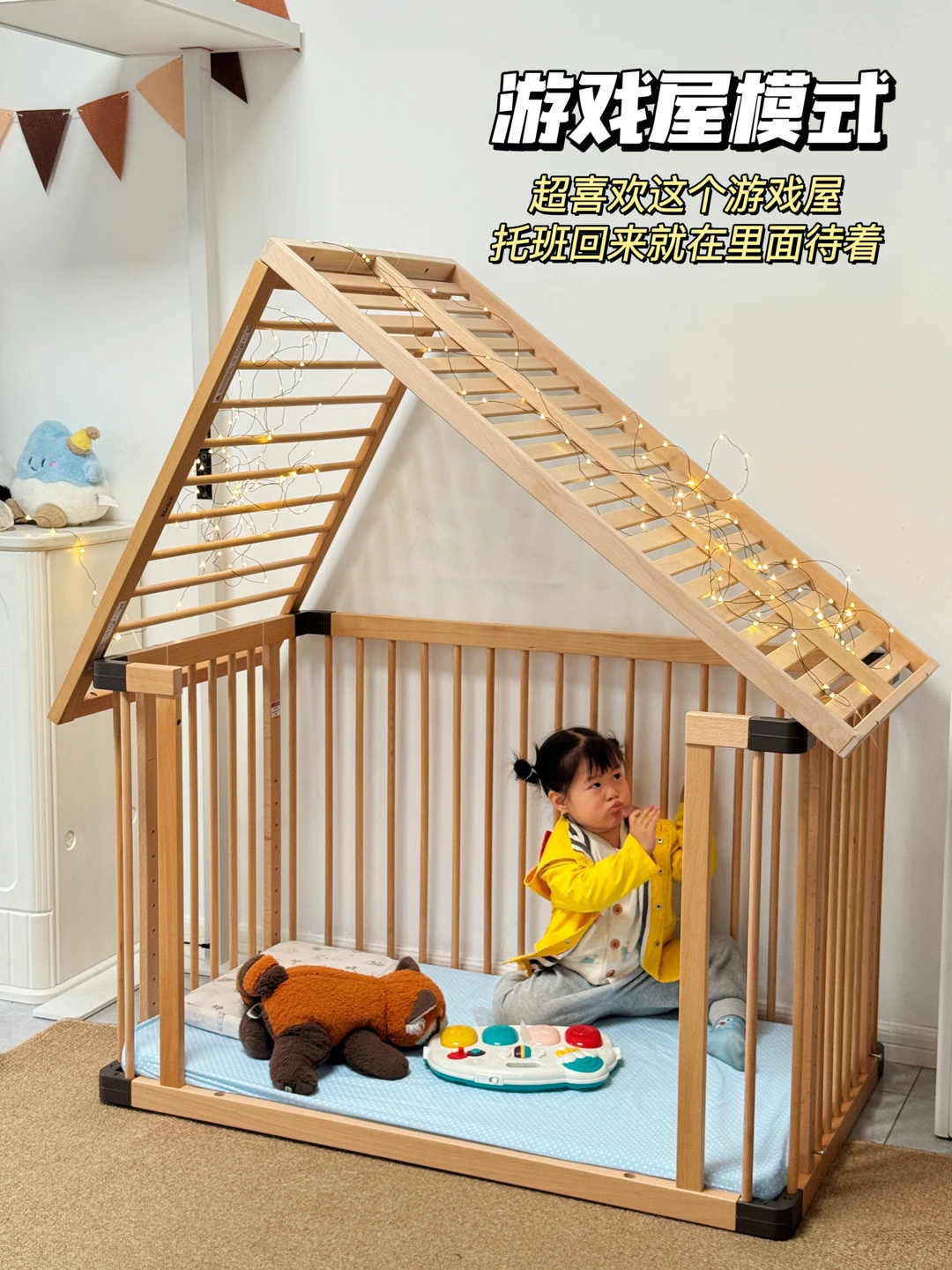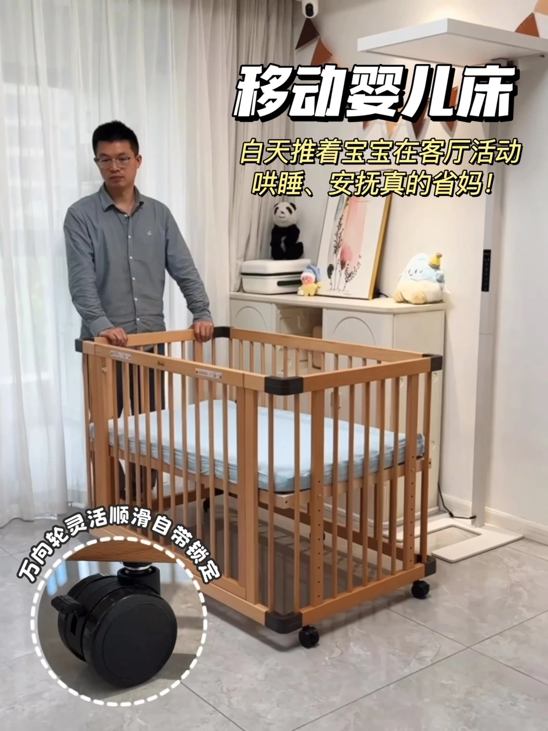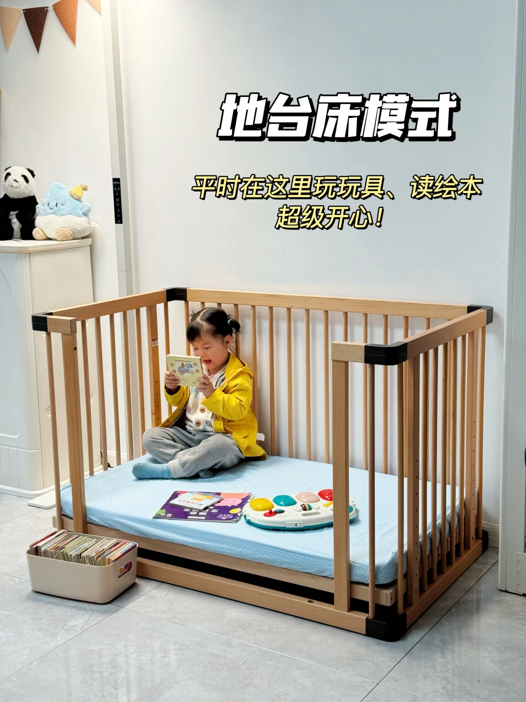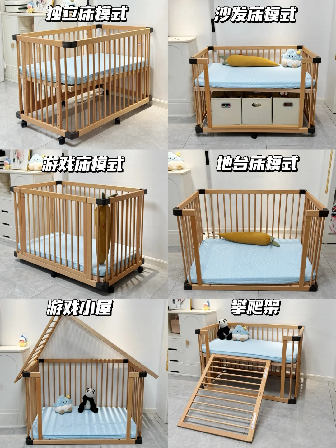 🌈 宝宝婴儿期,把婴儿床调节到和大床一样高,和大床无缝平齐拼接。晚上躺着喂奶、换尿不湿都不用抱起来,特别方便;9档调节适配各种大床的高度!两张床又相对独立,宝宝自己睡觉也避免了被大人压到、被大被子捂到。等宝宝大一些睡整觉了,就把两侧的围栏都装好,床板高度调低变独立婴儿床,宝宝自主睡觉互不打扰,也不担心夜里翻身打滚掉落。底部6个万向轮推动顺滑,推到客厅阳台到处活动,哄睡遛娃解放妈妈!等到学步期,调到最低档,宝宝可以在里面扶站学走游戏不怕摔倒掉下来。等宝宝大了,这个实木婴儿床还可以变成游戏屋、攀爬架,游戏区空间就这么轻松打造好了,直接省下大几千……