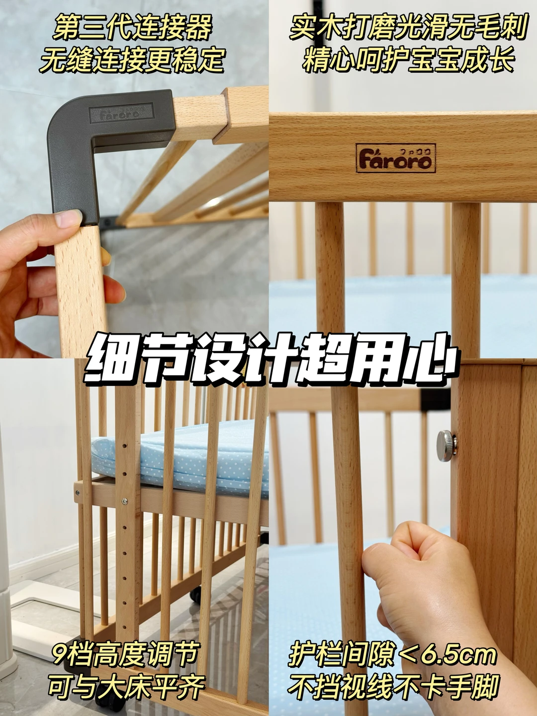 🌈 faroro家的实木家具材料真的没的说,纯实木打造无毛刺无异味,装好就能直接用,作为妈妈真的可以放心!细节设计也很有心,第三代连接器,插上就能组装,妈妈独自几分钟就能组装,特别省事!床护栏间隙不足6.5cm,不担心宝宝卡手脚,也不会遮挡视线!
