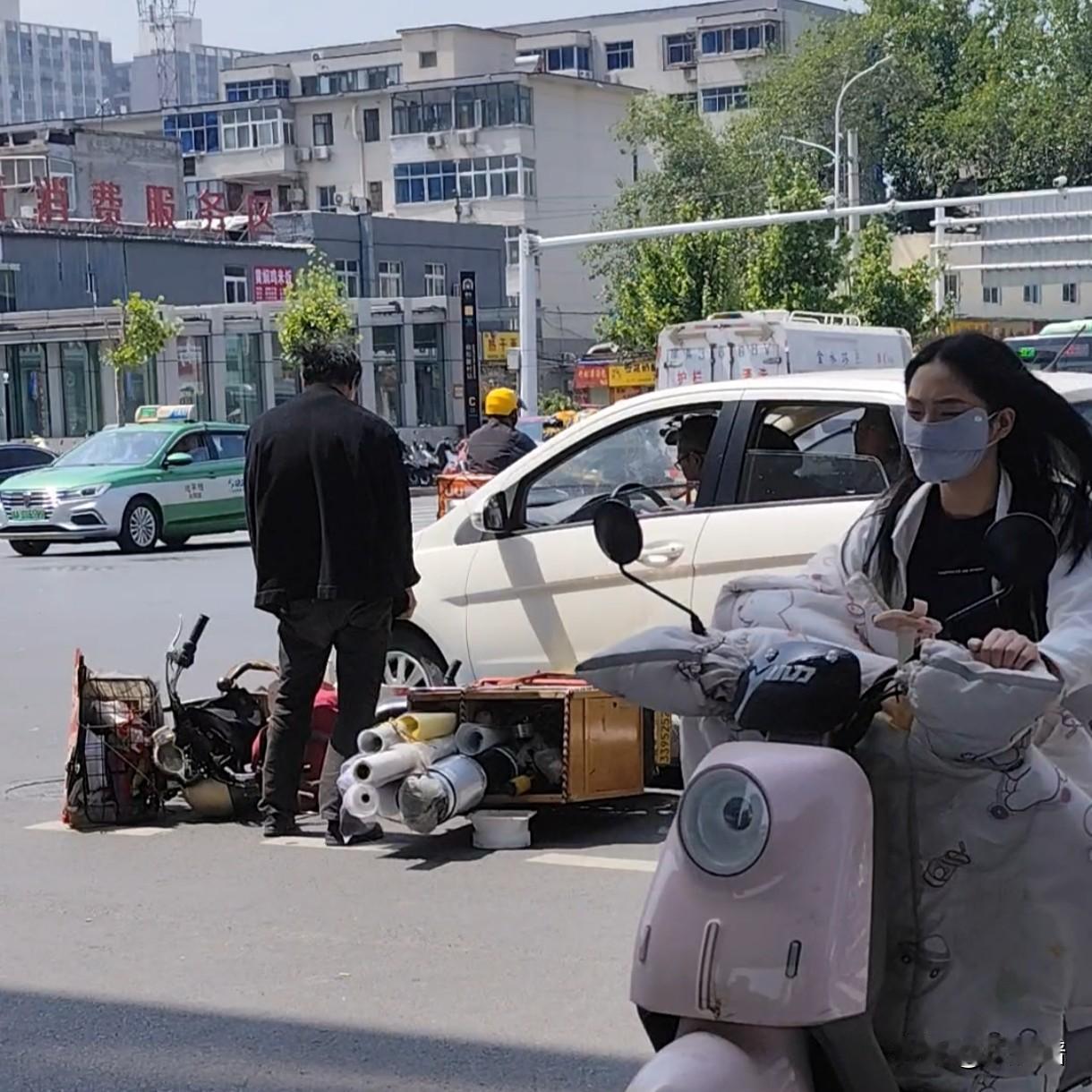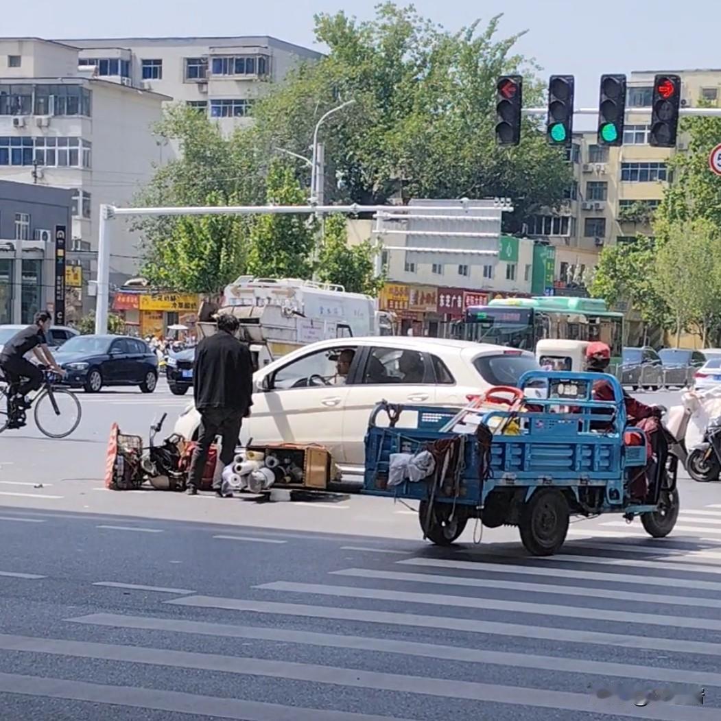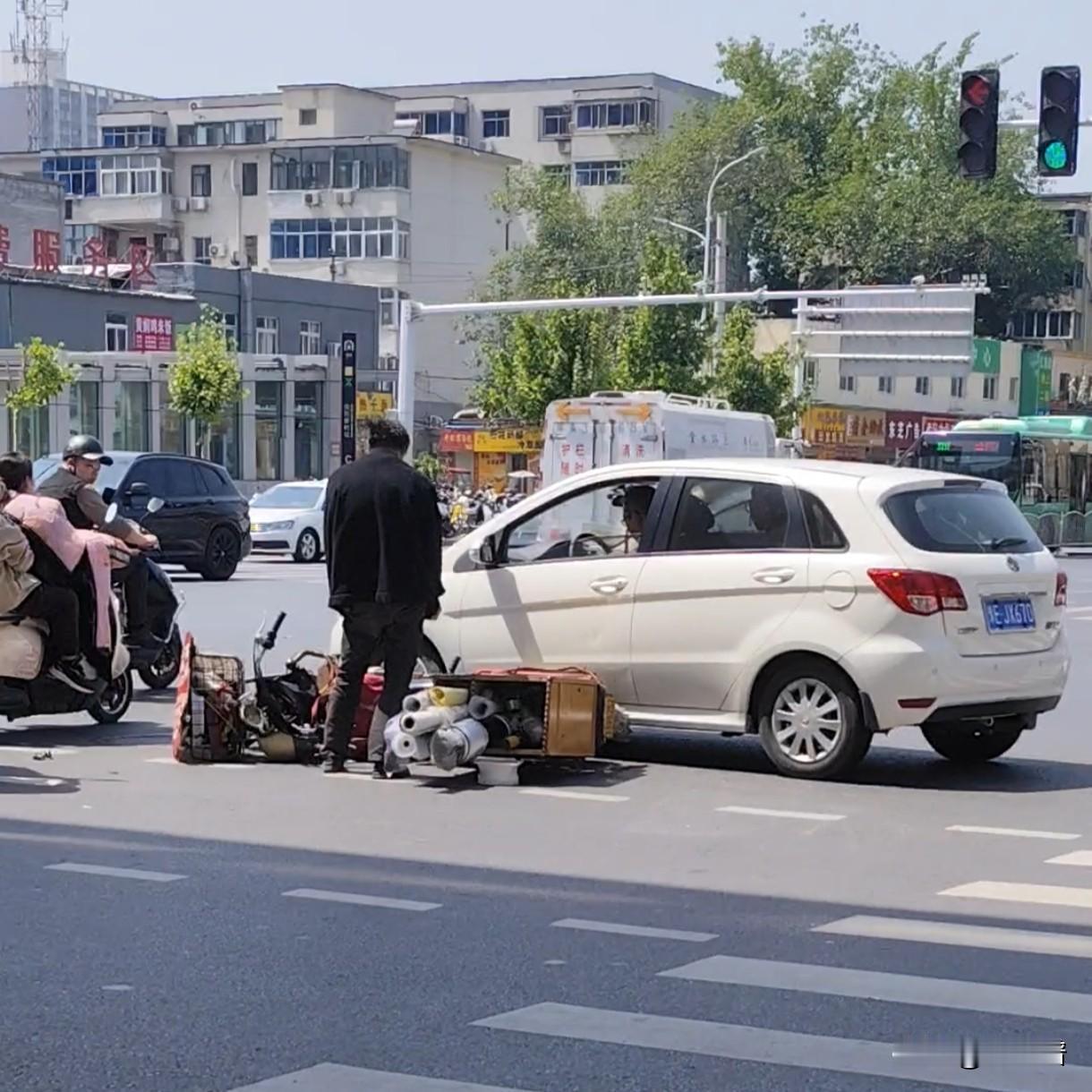 中午这会车辆和行人本来就不多,今天天气也非常好,视野很开阔,这都哦哟撞在一起,不知道非要往一起贴贴是什么意思。这一撞不打紧,忙中出错。
