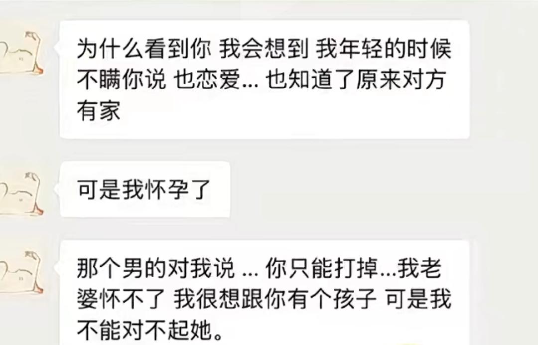 她当时年轻,怀了别人老公的孩子,结果对方说不想对不起老婆,哪怕对方当时怀不上孩子。