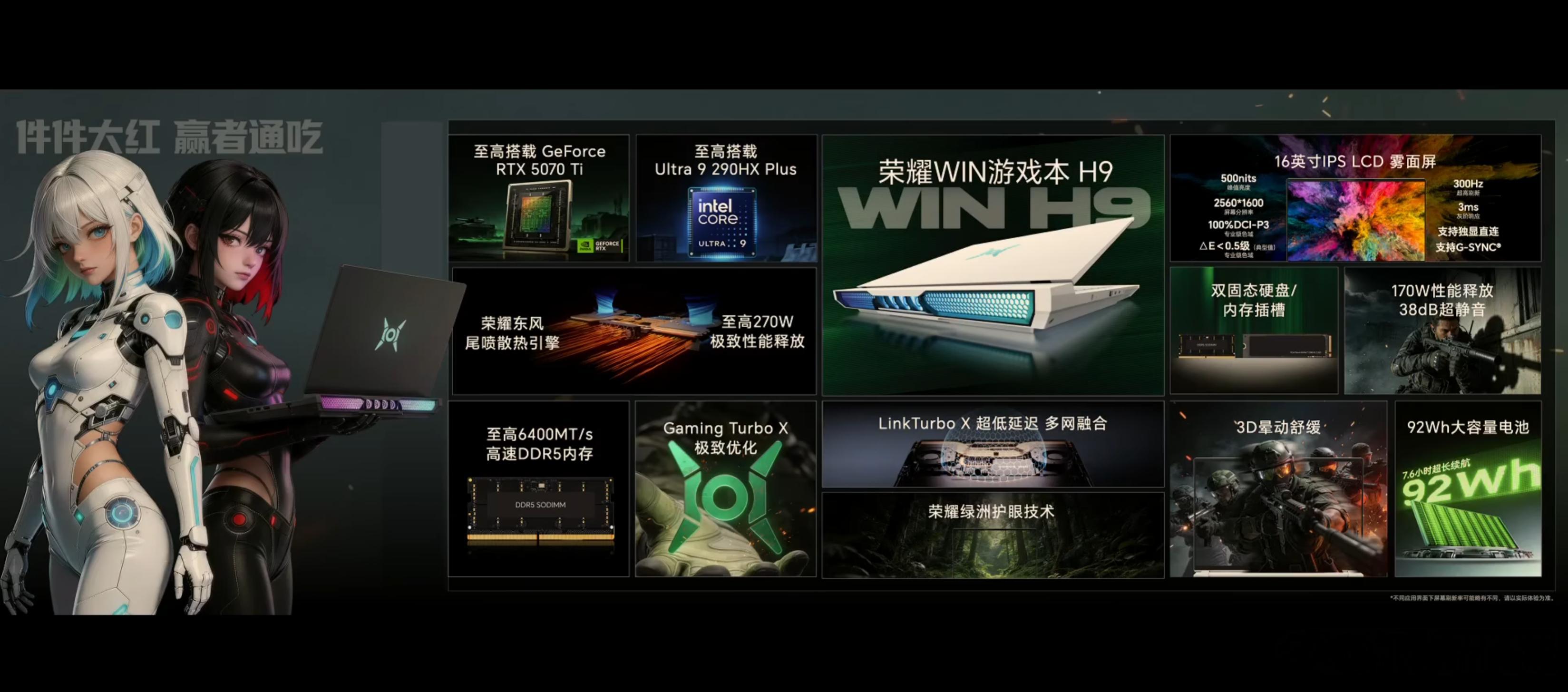 打洲本还得看荣耀WIN荣耀WIN系列游戏本发布了,荣耀WIN游戏本 H9至高搭载Ultra9 290HX Plus+满血版RTX5070Ti,在荣耀自研东风尾喷散热引擎下,最高270W性能释放(130W+140W)。