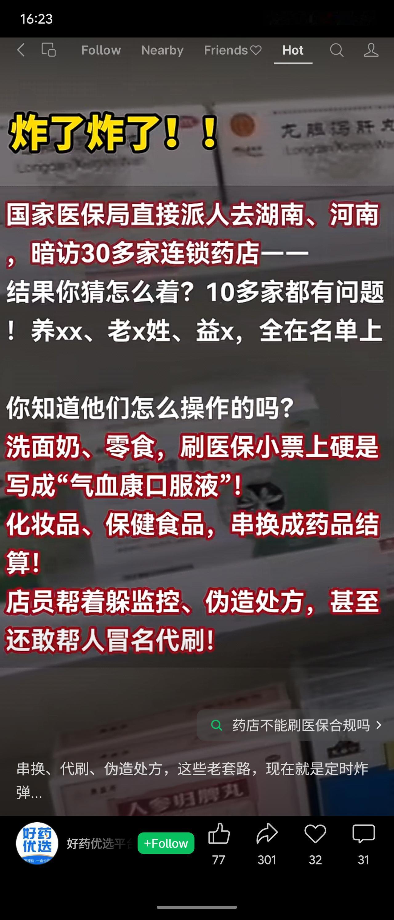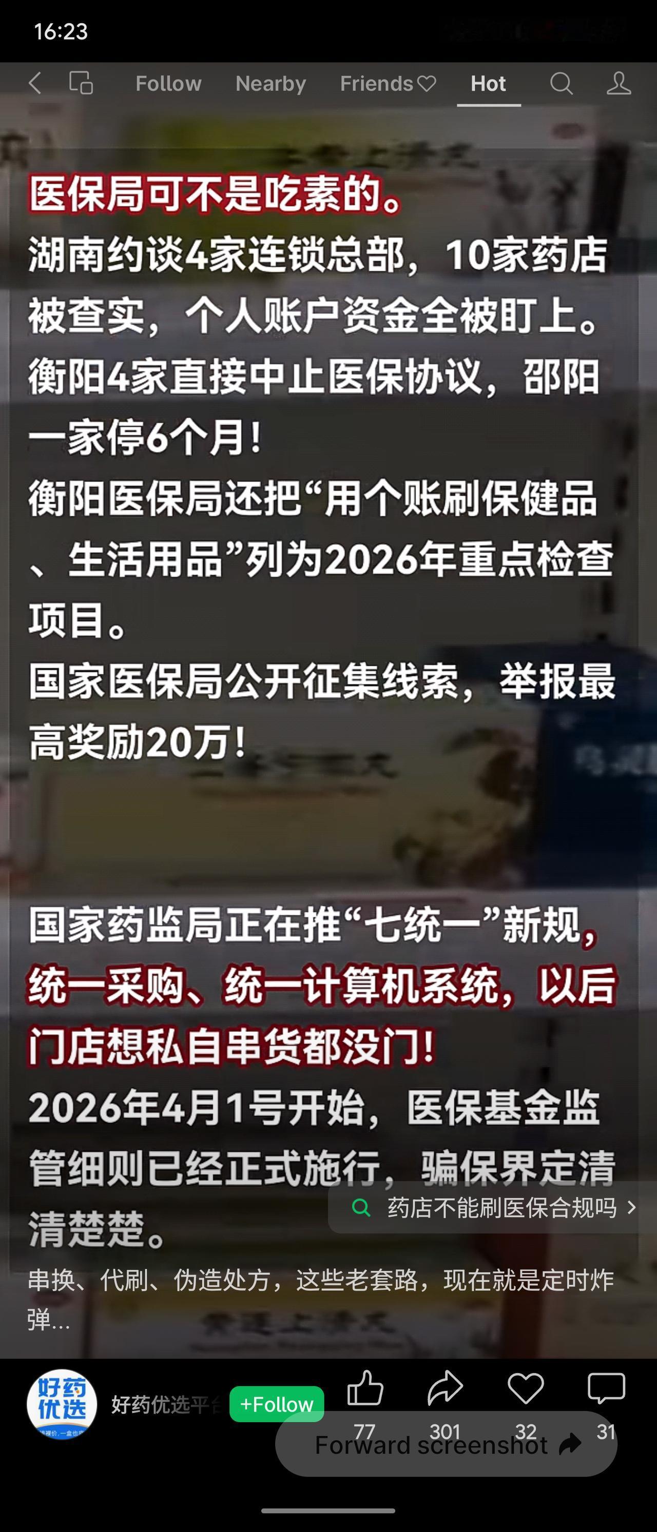国家医保局近期突击检查湖南、河南30多家连锁药店,发现10余家存在串换、代刷、伪造处方等骗保行为,涉及某丰、某百姓等品牌。湖南约谈连锁总部,多家药店被中止医保协议。自2026年4月1日起,医保基金监管细则已正式施行,举报最高奖励20万元。